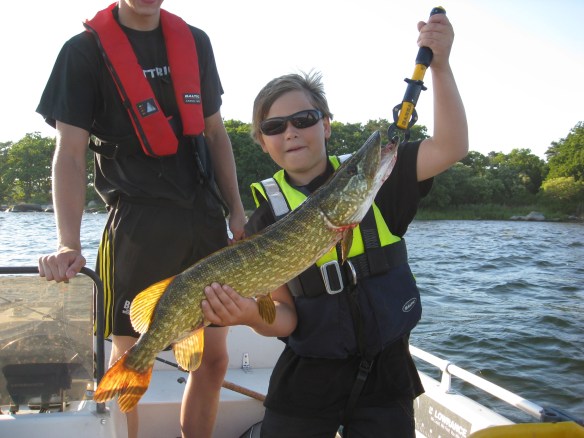 Efter resultatlöst gösfiske i Råbelövssjön utanför Kristianstad tackade vi med glädje ja till Victor Vestergårds inbjudan till kvällsfiske. Min fiskerulle hade gått sönder så jag var med som fotograf medans Willy och Viktor fiskade. Willy använde sig av en gäddspinnare med arbetsnamnet (show girl) Viktor trodde att gäddorna skulle gilla en jigg. Det blåste ganska bra från sydost och efter tredje kastet högg gäddan snabbt och glupskt på Viktors bete. Även Willy lurade upp en sprallig gädda med den pråliga gäddspinnaren. Under en timme landades fyra stycken friska sommargäddor stax under 3 kg. 3-1 till jiggen. Viktor fångade även en liten gädda på en Big Bandit (bruntorsk) när vinden hade mojnat. Vilket härligt sommarfiske i t-shirt och shorts!