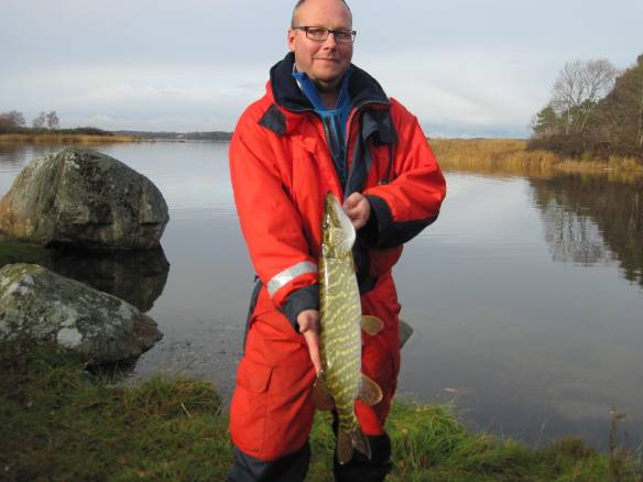 På grund av tidsbrist och lathet är Bustern fortfarande i garaget och inte i sjön. Willy har varit på ABU s gäddfiskeläger för undomar mellan 13-17år under höstlovet och lärt sig en massa tips om gäddfiske. Jag var grymt fiskesugen efter Willys berättelser om fisket i Järnavik så vi dissade arbetet med båten ännu en lördag och åkte och fiskade från land istället. Vädret utan vind förföljer oss även denna dag men det är ju kul att jerka och jag passade på att öva lite betesgång med pigen i det klara vattnet. Vi parkerade bilen på Dragsö och fiskade längs strandkanten. Jag plockade upp en liten krabat sedan var det dött, vi förflyttade oss till Långö där Willy tog dagens andra lilla gädda. I morgon måste jag ut i garaget så att båten snart kan sjösättas igen.