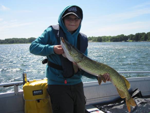 Vi tittade på sjökortet och valde ut några ställen som vi inte hade fiskat vid förut. Det blåste ganska friskt i Willys och mina ögon men vinden var varm så det var skönt att fiska i blåsten. Våran plan över fiskeställen visade sig motsvara våra förväntningar för de levererade många fina fiskar i hyfsad storlek. Jag klantade mig och tappade i en gädda i 5kilos klassen över relingen innan mätning men den hade nog varit ca 90 cm. En gädda över metern lossnade strax innan inhåvning för Willy.Vi kämpade för att få tio gäddor över relingen men vi fick upp nio innan vi blev för hungriga och avbröt. Den största gädda som vi mätte idag var 86 cm lång men det var lite snöpligt att det inte blev tvåsiffrigt.