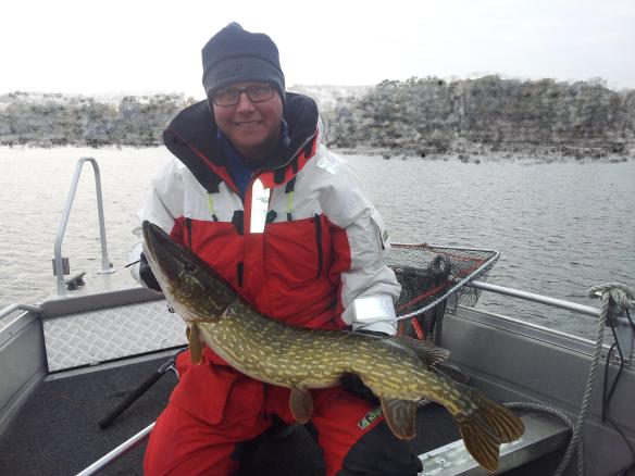Lördagen hade kommit och det var dags att fiska en heldag. Vädret var det inget att klaga på, mulet och ganska lagom med vind så det kändes som om det skulle bli ett riktigt bra fiske för oss idag. Jag agnade med min nya svartzonker och Viktor valde en gäddfluga som var ny för dagen. Vi bommade på de fyra första ställerna och självförtroendet var i botten då det äntligen small på hos mig. Det skvätte lite i ytan och jag trodde att det var en liten gädda som var felkrokad för den var ”bara” trög att ta in till båten. Det visade sig när den närmare sig båten för landning att gäddan var riktigt fin och behövdes håvas. Viktor skötte håven exemplariskt och jag ledde in gäddan i nätkassen. Gäddan var lite längre än vi trodde, den mätte hela 97 cm och vägde strax under sex kilo så det var en jättefin gädda. Viktor fick upp ett par gäddor till på ungefär samma ställe men sedan var det dött igen. Vet inte riktigt varför gäddorna var så svårflörtade idag för jag tyckte faktiskt att det var riktigt gäddhuggarväder.