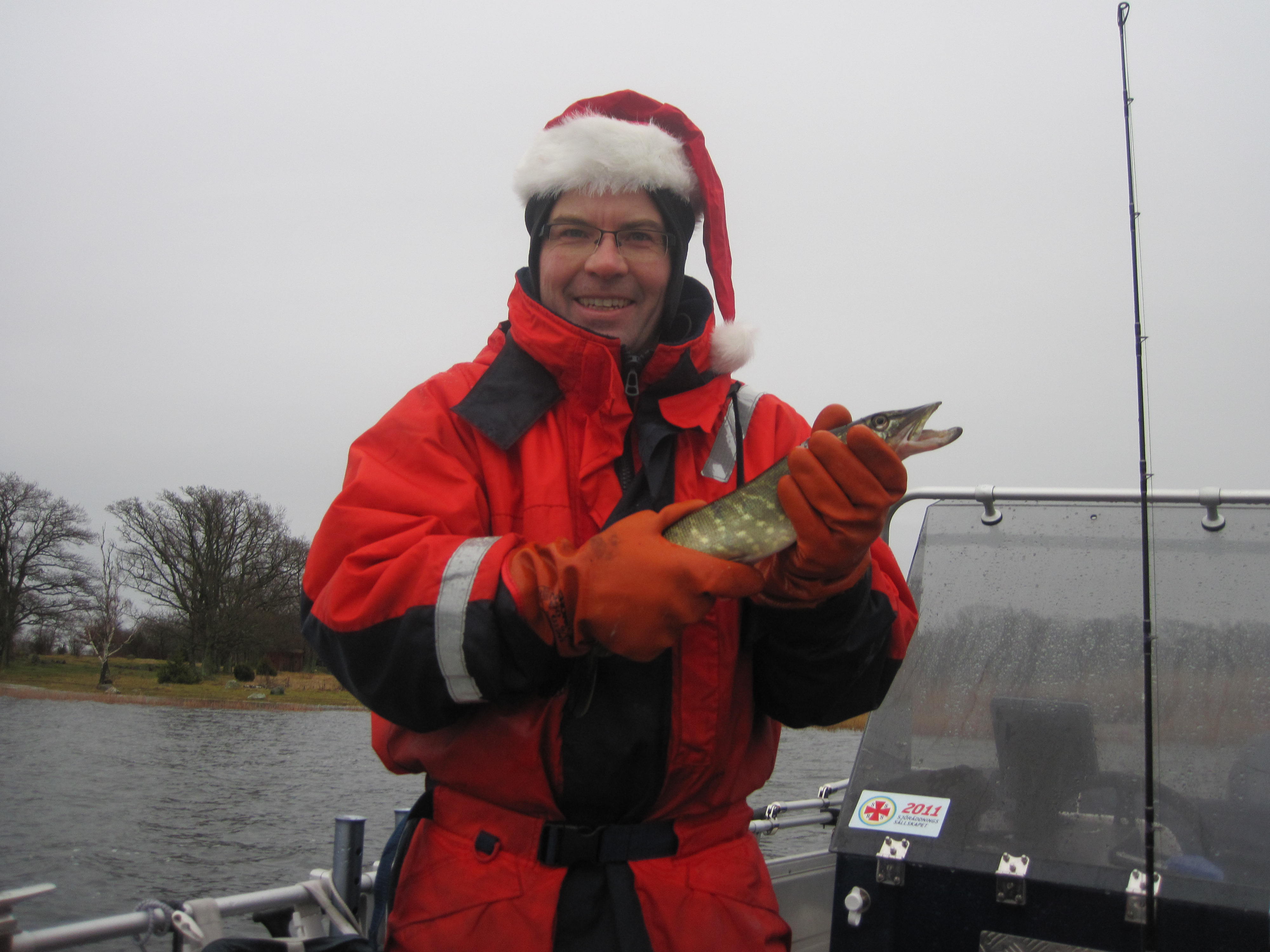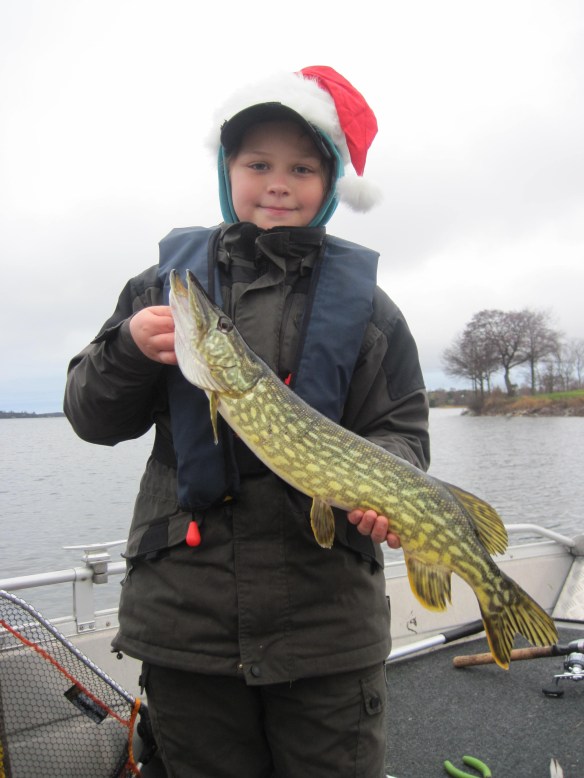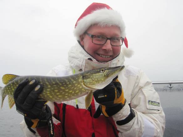 Denna jul välsignades vi med mildväder och ingen snö. Vädret var helt ok ur fiskesynpunkt med svaga västliga vindar lite regn och ett enormt högvatten. Svågern lånade ett haspelspö och gled ned i våran extra flytoverall sedan var vi på väg mot fiskevattenet. Tiden var knapp för klockan två var det dags att dricka glögg, kaffe och äta av svärmors 15 olika kakor. Vi siktade in oss på säkra höstgäddvatten och de gjorde oss inte besvikna. Willy drog snabbt upp den första och dominerade kraftigt med att få gäddkontakt. Svågern och jag bara tittade på och blev smått irriterade när vi hörde honom glatt säga ”fish on”. Det vände efter att ätit bullens pilsnerkorv och vi hade ett kanonfiske. Vi hade ett osannolikt trippelhugg när vi hittade gäddorna som stod i klump inblåsta i en grundvik. Fisket var faktiskt så kul att vi kom försent till kakfatet.