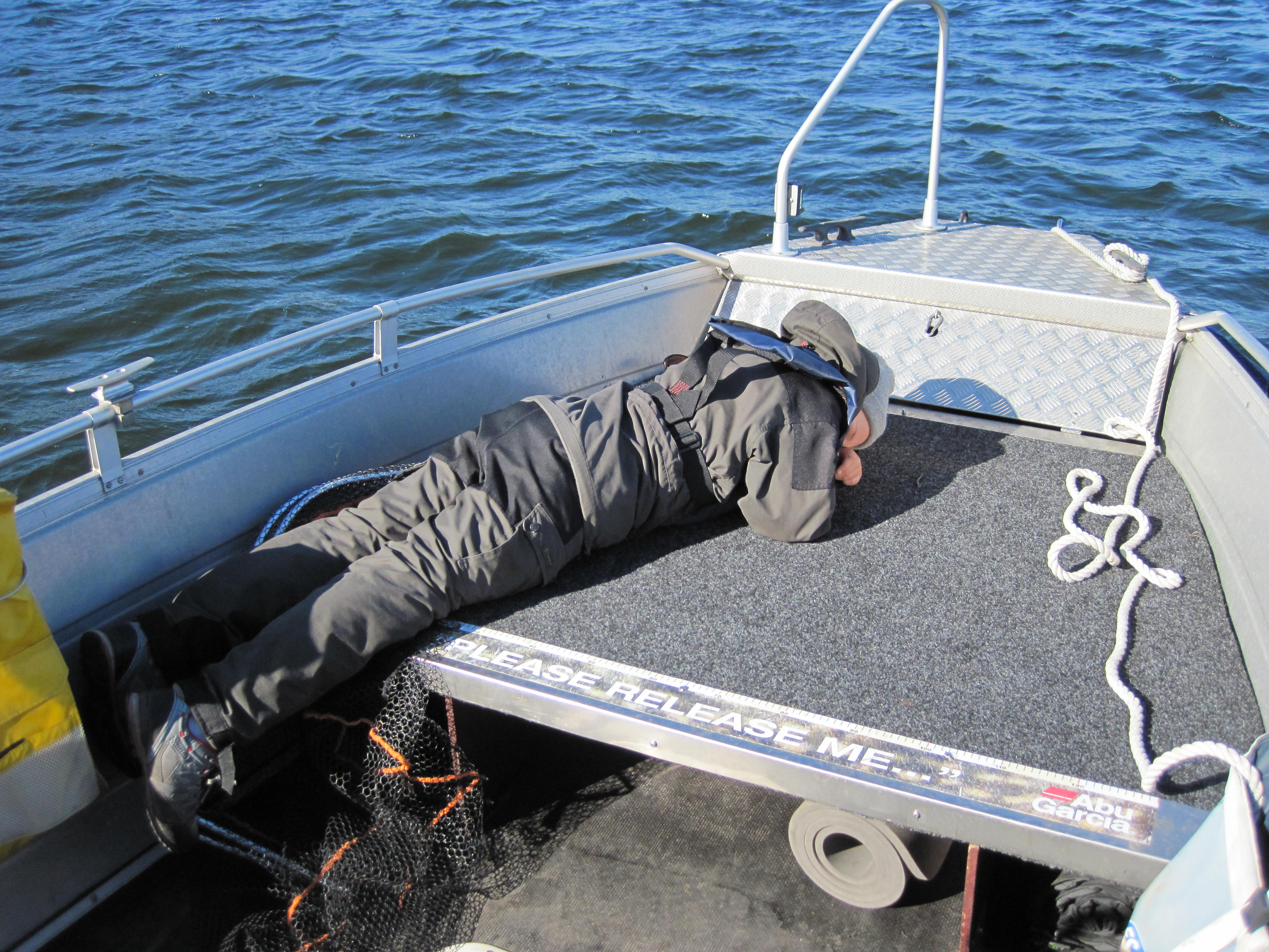 Vi tappade sugen och efter att ha avnjutit en deluxmacka med ägg och bacon så la vi oss på kastdäcket och vilade oss innan vi åkte hem genom den grova sjön.