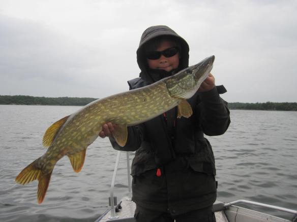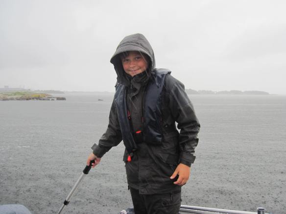 Men inte hindrar regnet oss från att fånga lite gäddor. Idag har vi bara varit på välkända gäddställen i mellanskärgården med varierat resultat. Antagligen fanns det gäddor på samtliga platser som var huggvilliga men spagettin som låg i ytan gjorde det omöjligt att fiska ordentligt. Nåja vi hade faktiskt riktigt kul fiske. Vi hade gott om kontakter med både stora och små gäddor. Den största som kom över relingen idag var 84 cm lång och den fångade Willy Han hade även en hyfsad följare som såg bred och lång ut i vattnet, uppskattningsvis stax under metern. Han har förtrollat sin Big Bandit Jeppan så idag vann han med 3-2 familjekampen.