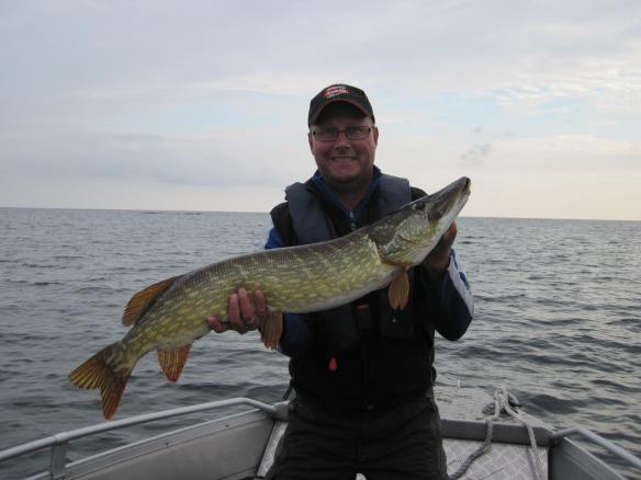 Idag var vi mera fokuserade och taggade på att fiska och vi satsade helhjärtat på att fånga stor gädda. Efter att tankat båten för massvis av pengar (102 liter bensin) så hade vi en aktionradie som heter duga med båten. Vi styrde båten utåt i skärgården till nästan okända vatten för oss och fiskade och nötte på så bra vi någonsin kunde. Resultatet var magert, en och annan strögädda och tillråga på allt så var gäddorna små. Vi kommer till ett ställe där vi har kontakt med massvis av små och något bättre gäddor men de följer enbart efter och biter bara försiktig i våra beten. Vi börjar faktiskt att krokna och vet inte riktigt hur och var vi ska fortsätta att fiska. Vi flyttar oss till en ny bränning och jag byter stampes bete mot en liten wolfie.Smock där sitter äntligen en bättre fisk, hon kämpar på bra och drar ut lina vid ett flertal tillfällen. Det är en sådan uppfriskande känsla att tampas med en finare sommargädda. Vi mäter och väger henne till 93 cm och vikten av 6,1 kilo. Kalasfin gädda! hon är ganska trött så vi låter henne återhämta sig i håven innan vi låter henne simma vidare.