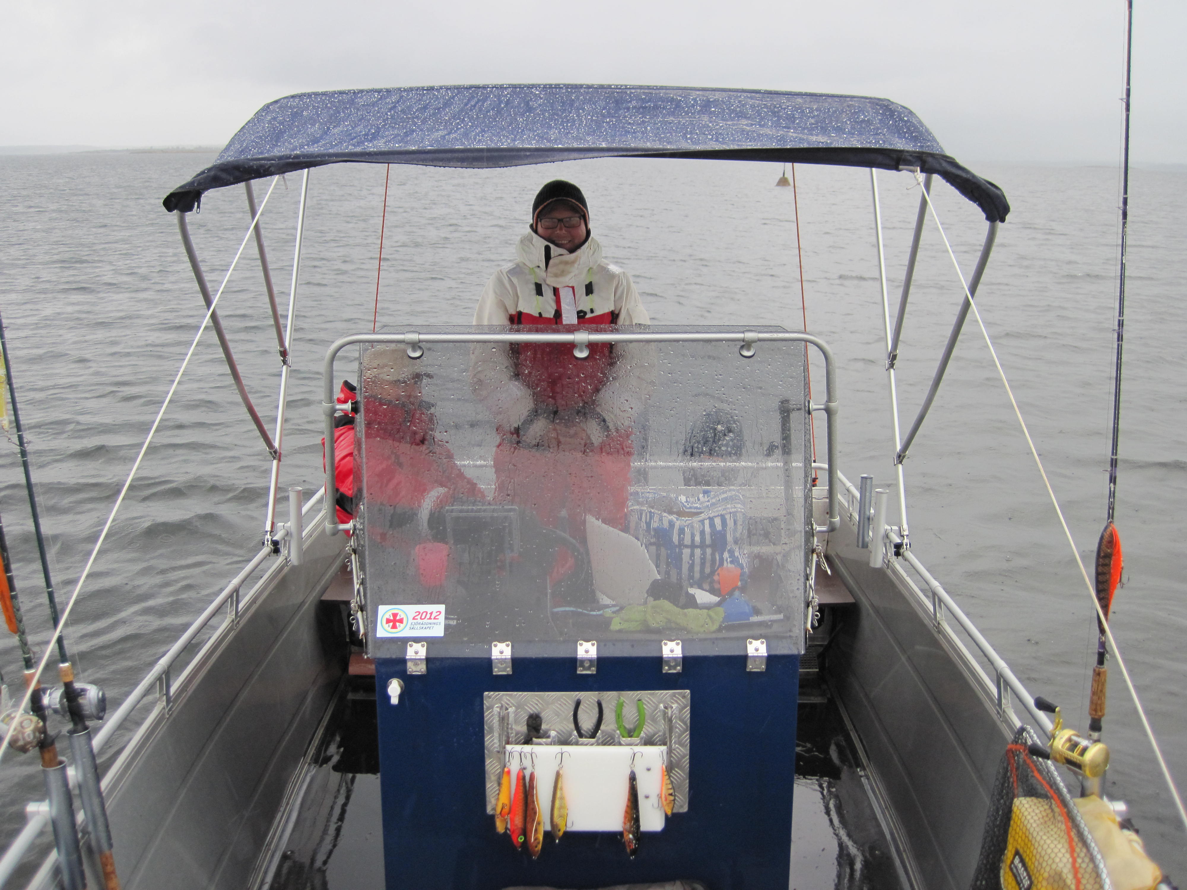 Efter att ha ätit och torkat våra underställ och strumpor i torktumlaren så var vi på banan igen. På med de genomblöta overallerna och sedan ut på sjön. Hur svårt kan det vara att fånga en gädda på minst 75 cm.