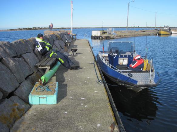 Det var kallt på morgonen, termometern visade -4 grader och den svaga vinden kom från norr. Båten var full av rimfrost och förtöjningstamparna var stela av is. Nåväl motorn startade fint och snart var vi på plats i grundviken.