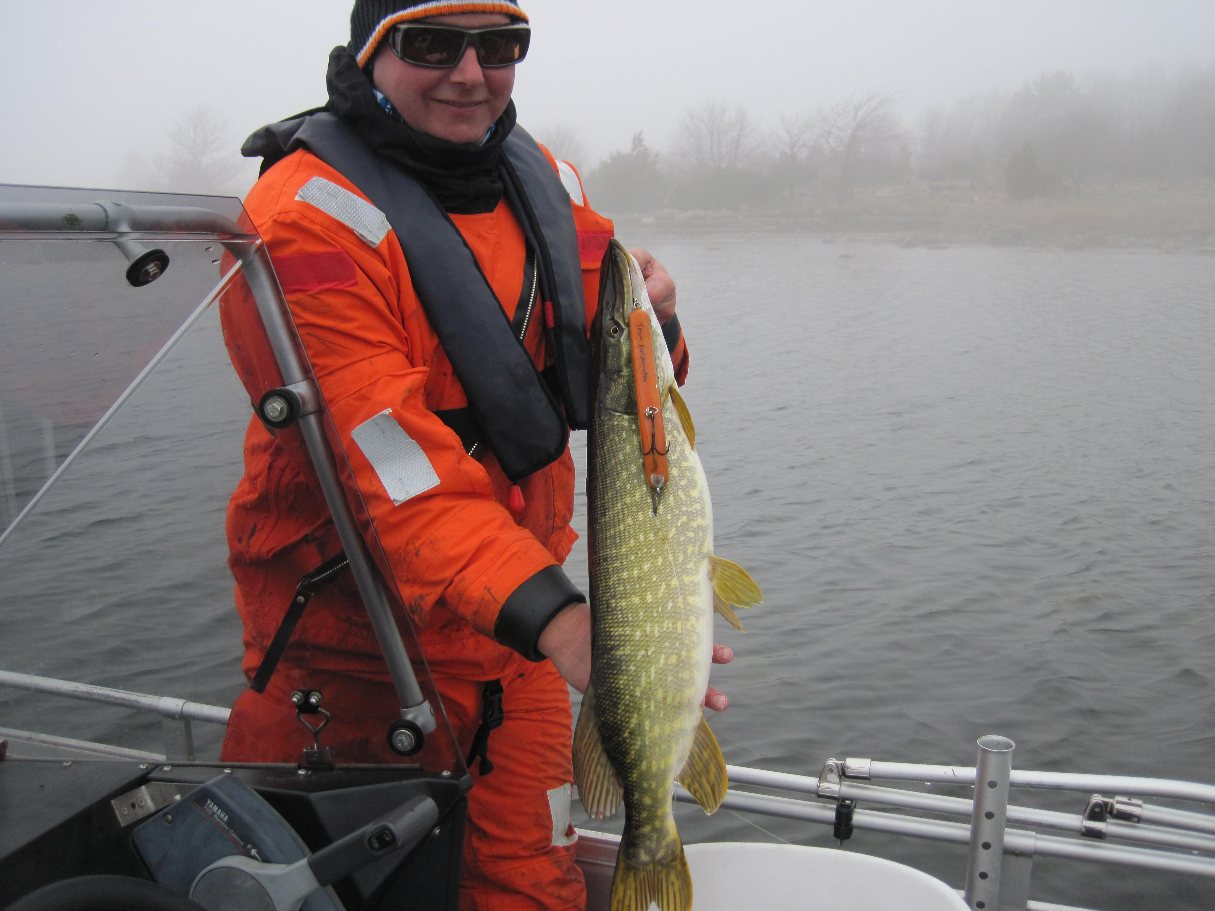 Riktigt soligt och fint väder denna söndag, svaga sydliga vindar. Jepp det mesta var bra. Lågvattnet håller i sig så man är lite frustrerad över att inte kunna fiska i vikar som normalt bör fungera och leverera gädda. Vi åkte på en liten utflykt till både kända och okända fiskeställen för oss. Vårat första, andra, tredje, fjärde, femte stopp levererade noll och det kändes som om våran plan skulle misslyckas totalt. Självförtroendet var inte på topp men vi nötte på och efter en välförtjänt fikapaus så rullade dimma in och skymde solen. Willy satte på ett mörkt bete och vips så hade han kontakt. Jag vet inte om det var dimman, betesvalet eller bara att vi hittade rätt ställe men nu var det kul igen. Många kontakter ythugg och följare. 11 gäddar landades av mindre storlek men vad gör det när fisket är spännande och händelserikt efter flera timmars downperiod.