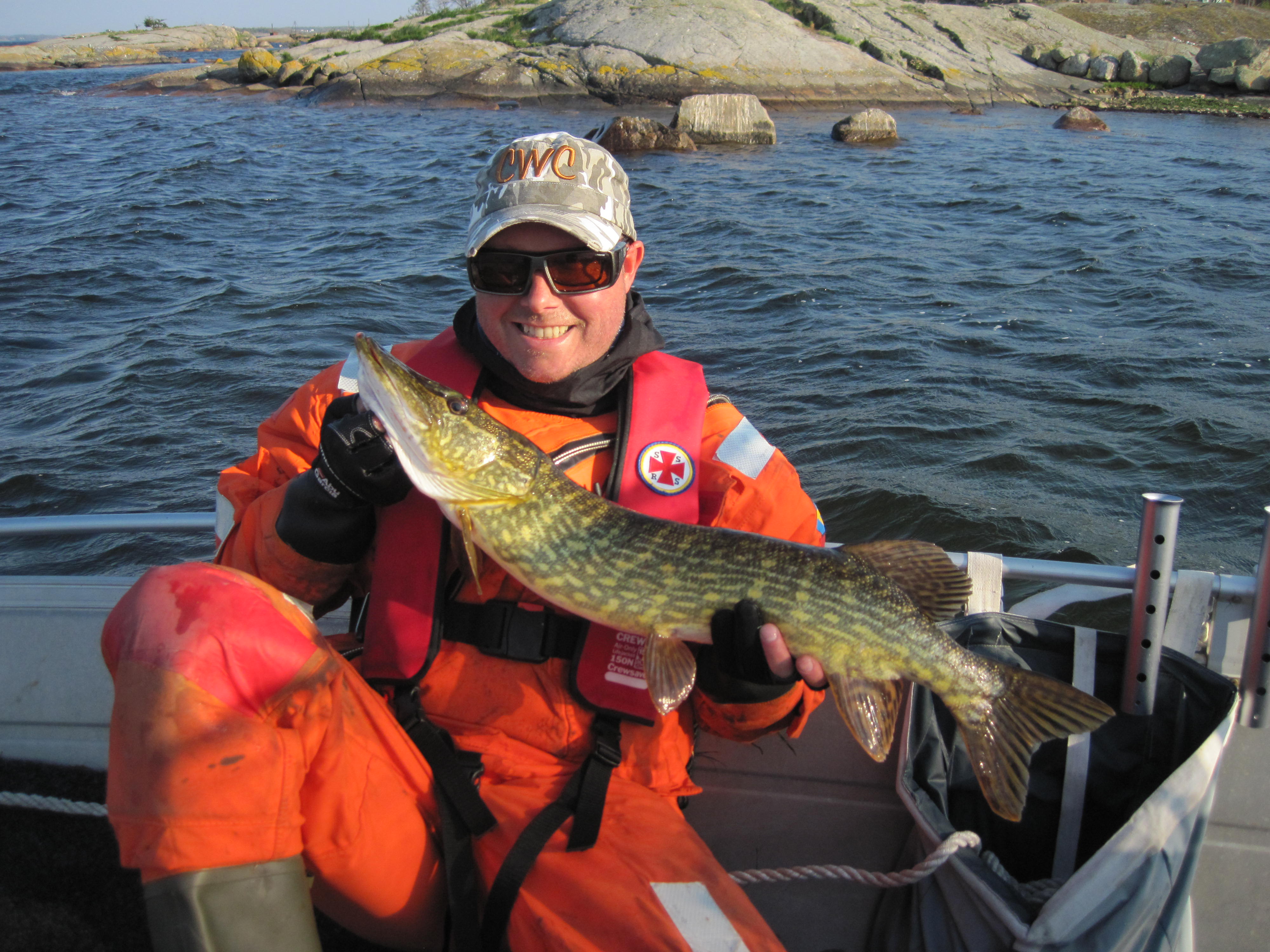 Det blåste ganska mycket och vi satsade på att fånga några feta sillagäddor runt omkring Karlskrona. Vi ankrade och fiskade på vindsidan av småöarna och visst var gäddorna huggvilliga. På någon timme hade vi landat fyra småtjocka gäddor som säkert smaskat på sill efter leken.