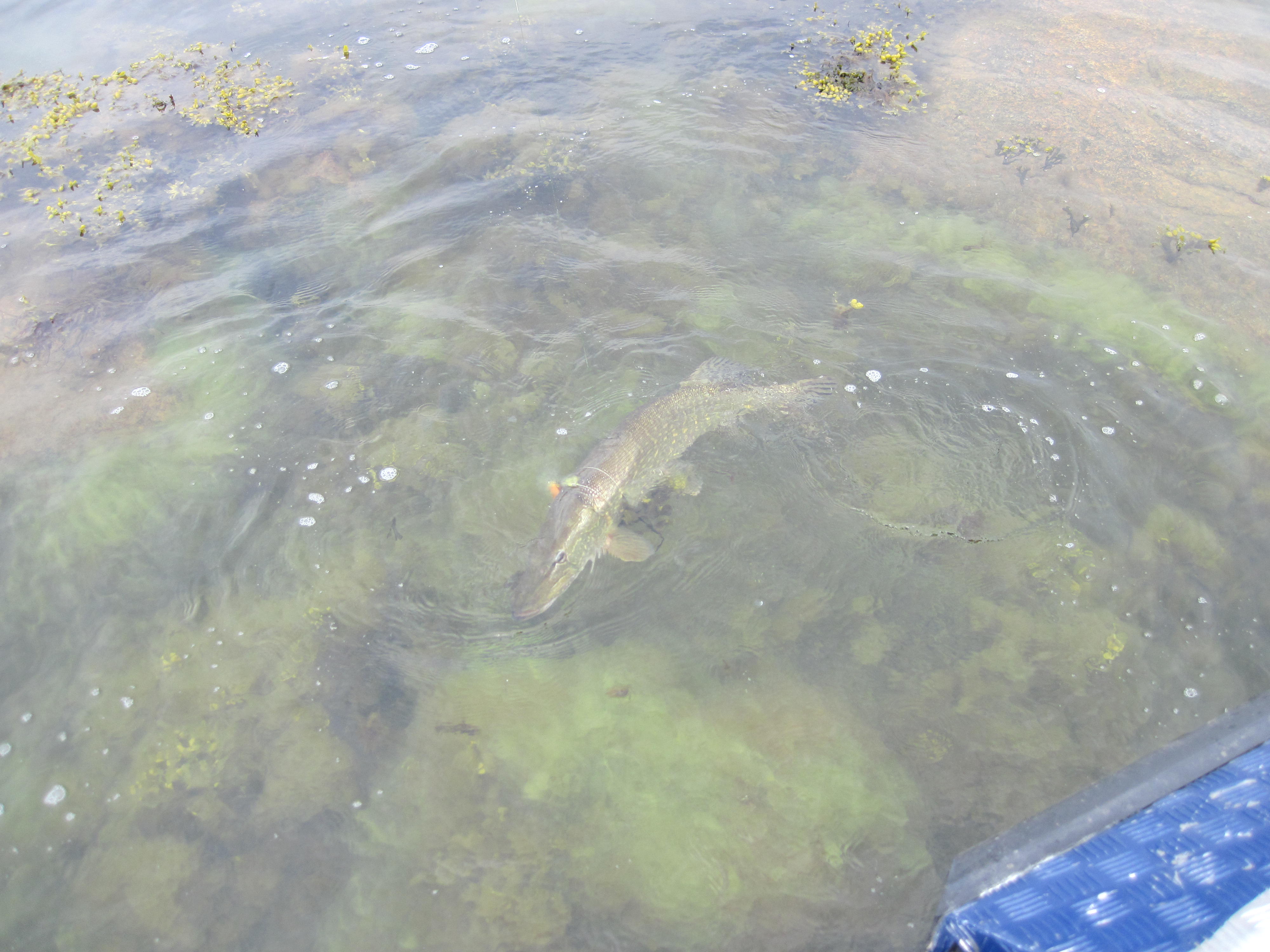 Det kändes som en evighet sedan vi var ute på gäddjakt. Det är många tråkiga göromål som måste fixas under våren och försommaren. Idag var vi lediga men enligt väderprognosen så skulle det regna hela dagen. Efter en riktig åskurladdning och ett skyfall utan dess like tänkte vi att det kan knappast bli värre så vi knallade ned till båten vid tolvtiden. Vinden var väldigt svag och det duggade när vi kom till första stället där vi valde att fiska på skärets norra sida. Detta var totalt resultatlöst, små och försiktiga hugg men inga krokade gäddor. Vi gled runt och fiskade på den södra sidan istället och nu klev dagens största gädda på. Hon bet hårt och skoningslöst och var råstark. Gäddan gick i sidled drog ut lina och hoppade som en lax i ren ilska över att vara fångad. Till slut hade hon rullat in sig i tafsen och stod stilla i tången på mycket grunt vatten. Willy paddlade dit så vi kunde lyfta in gäddan för vägning samt längmätning.