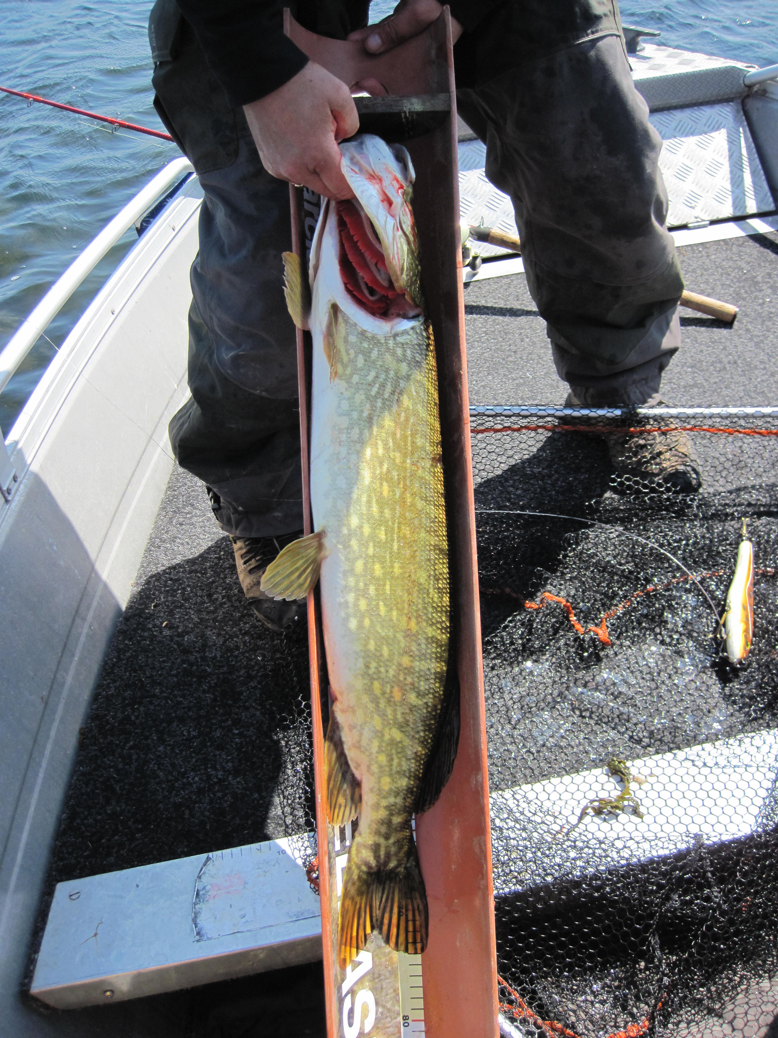 Det tog 42 minuter innan den första mätbara gäddan landades av mig. Denna var endast 70 cm men det skulle faktiskt ta fyra timmars fiske innan Willy krokade en gädda på 74 cm. Två minuter senare landade jag den tredje mätbara gäddisen. Denna var precis mätbar och nu började vi hoppas på att fånga fem gäddor över 65 cm.