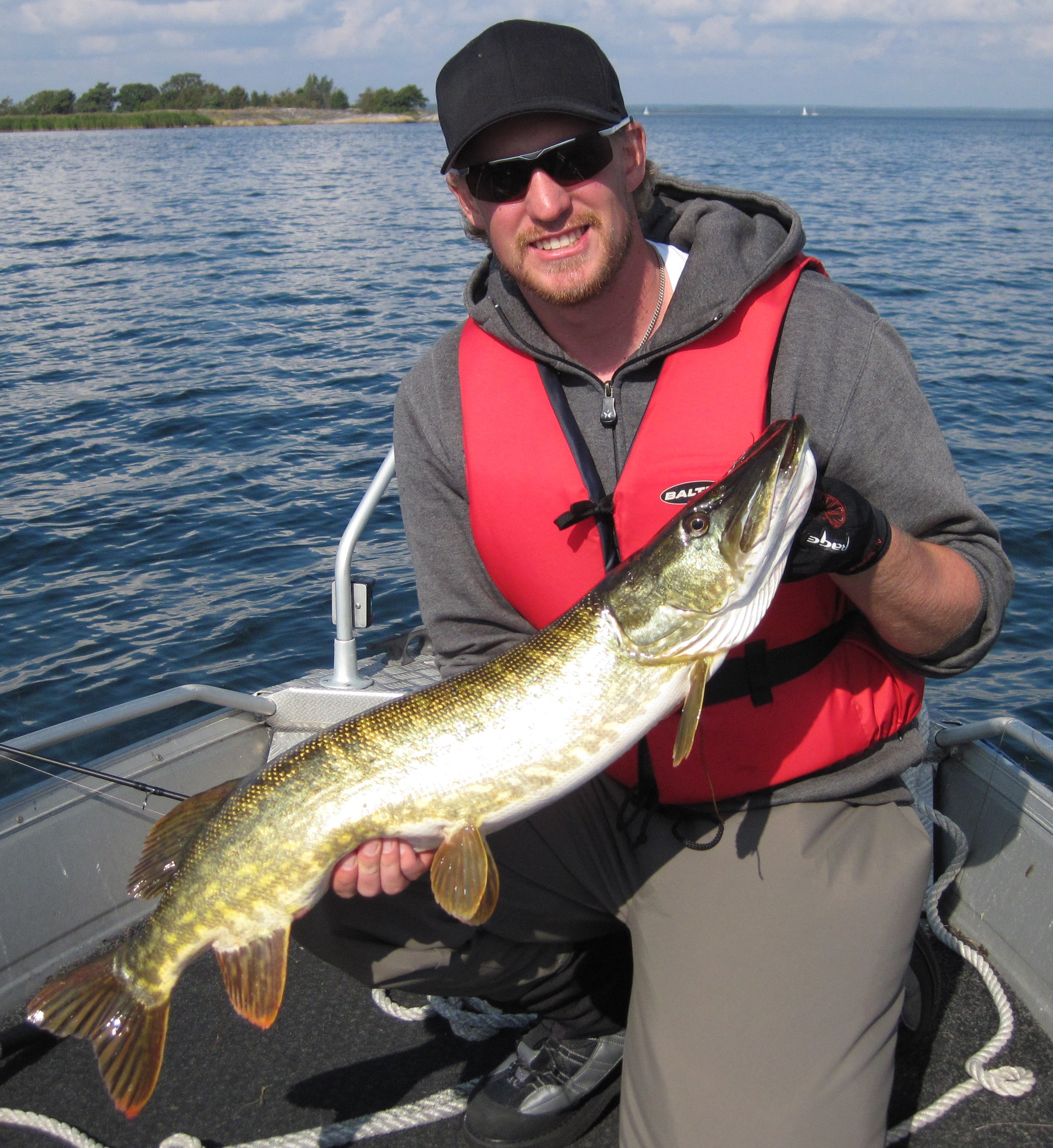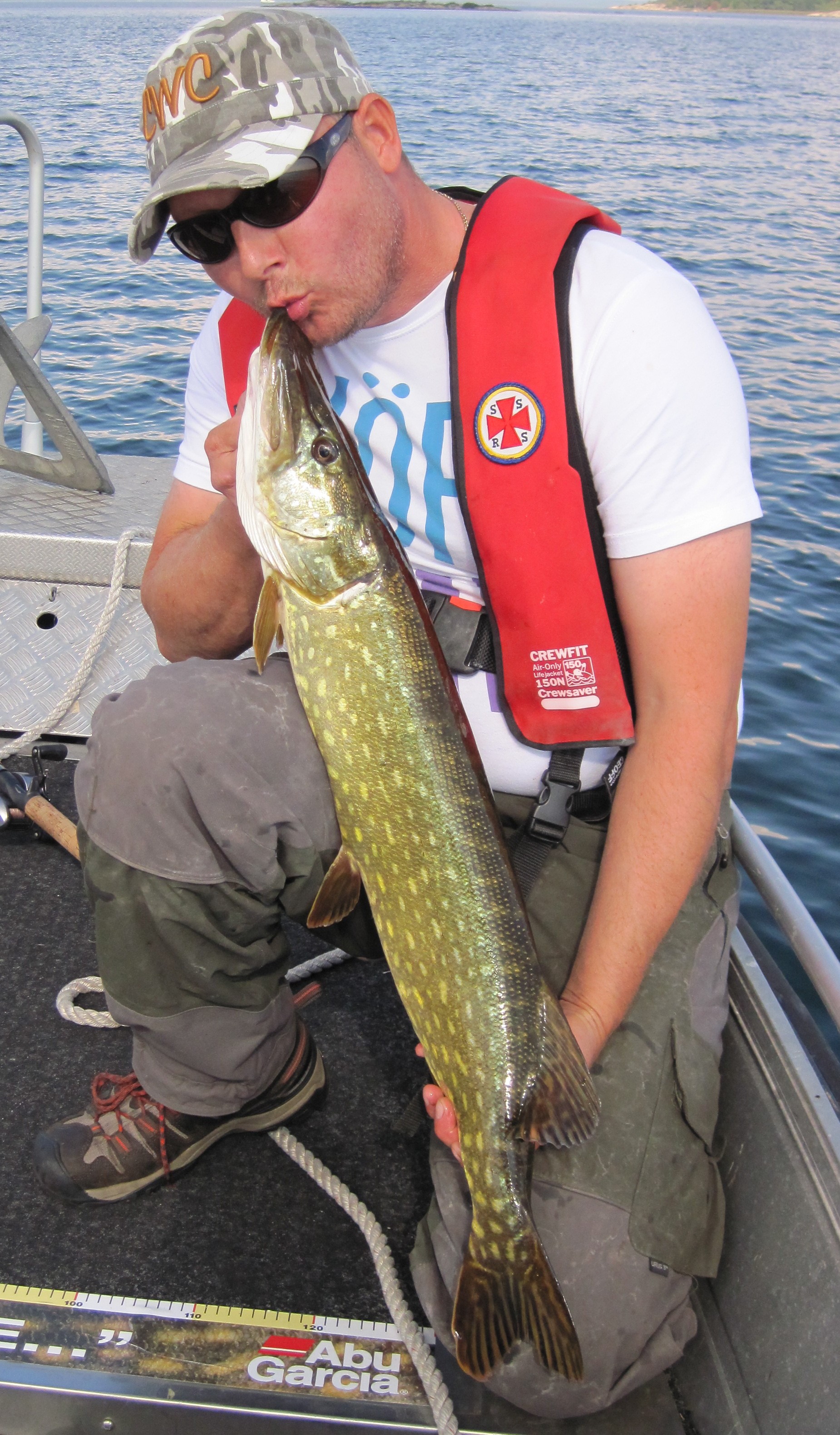 Samling i Lyckebyån stax innan nio och sedan iväg mot Preem för att tanka. Här blev det lite problem och vi sinkades en halvtimme för kortautomaten var ur funktion och vi var tvungna att ”dunktanka” och det är alltid lika tråkigt. Det blåste svaga nordliga vindar som sedan övergick i ostliga så planen var att hitta lite nya trevliga platser som kan hålla fina gäddor. Jag och Viktor agnade på med varsin Realeel i olika färger och Martin valde en Mcmio med en glittrig tail. En östlig kant valdes som vi aldrig hade fiskat vid. Det såg ruskigt hett ut men det var riktigt mycket spagetti i vattnet så det var svårfiskat. Vi lurade upp ett par tre stycken här ändå, Viktor hade en följare i 90cm klassen som vägrade bita. Efter några sidoförflyttningar svängde kanten och nu fiskade vi inte direkt i vinden utan drev i maklig och skön hastighet. Brunalgerna försvann plötsligt och vi fiskade på ca 2 meters djup mellan stenar och tångruskor. Huggen var många men gäddorna var relativt små. Jag hade en bättre fisk på men hon valde att kliva av strax innan landningen.