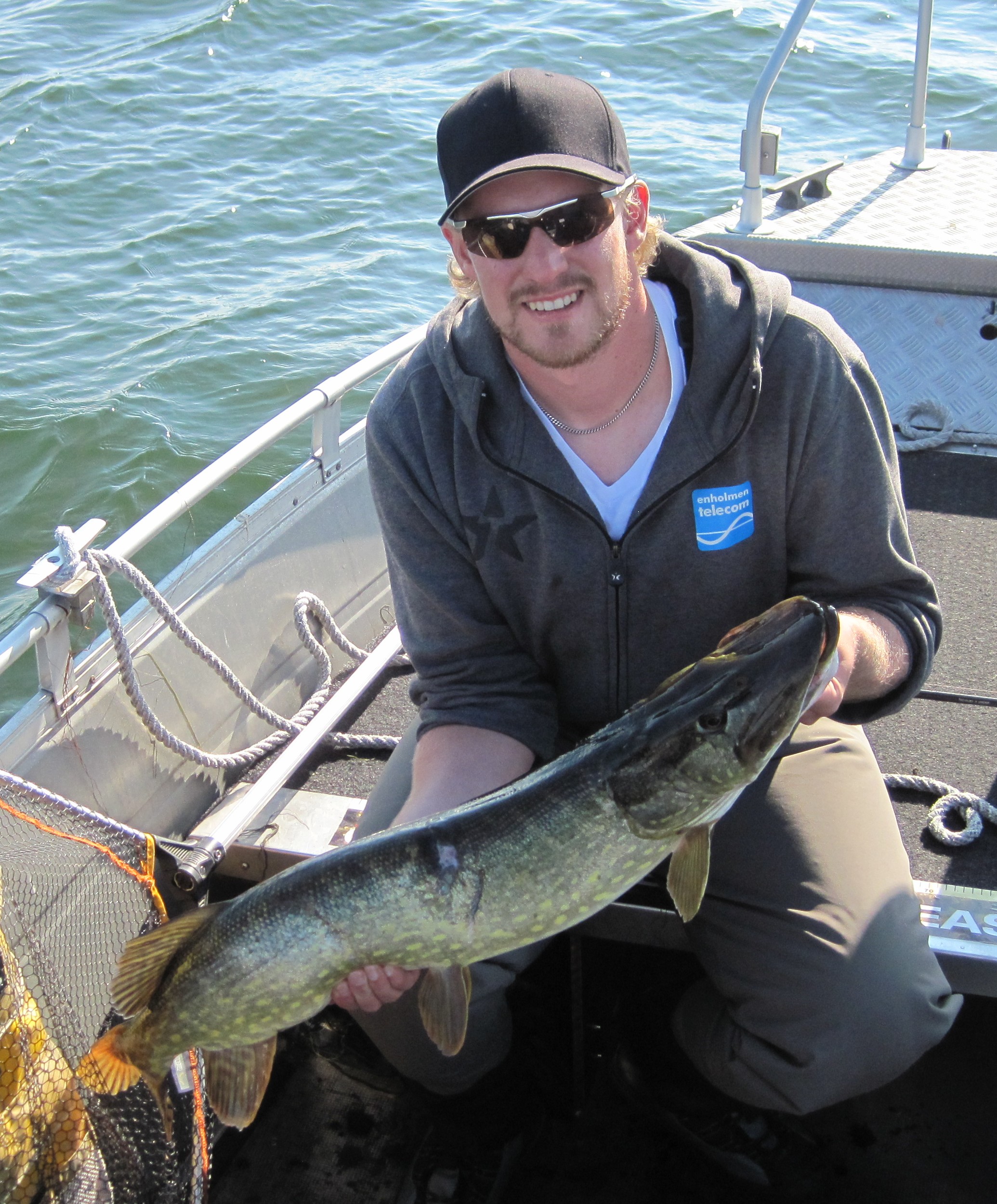 Vi förflyttar oss något och det smäller på hos Viktor, denna är strax under 80cm men en riktigt fin fisk. Under en halvtimme landas 5 fina och glittriga gäddor och vi känner oss glada och upprymda.