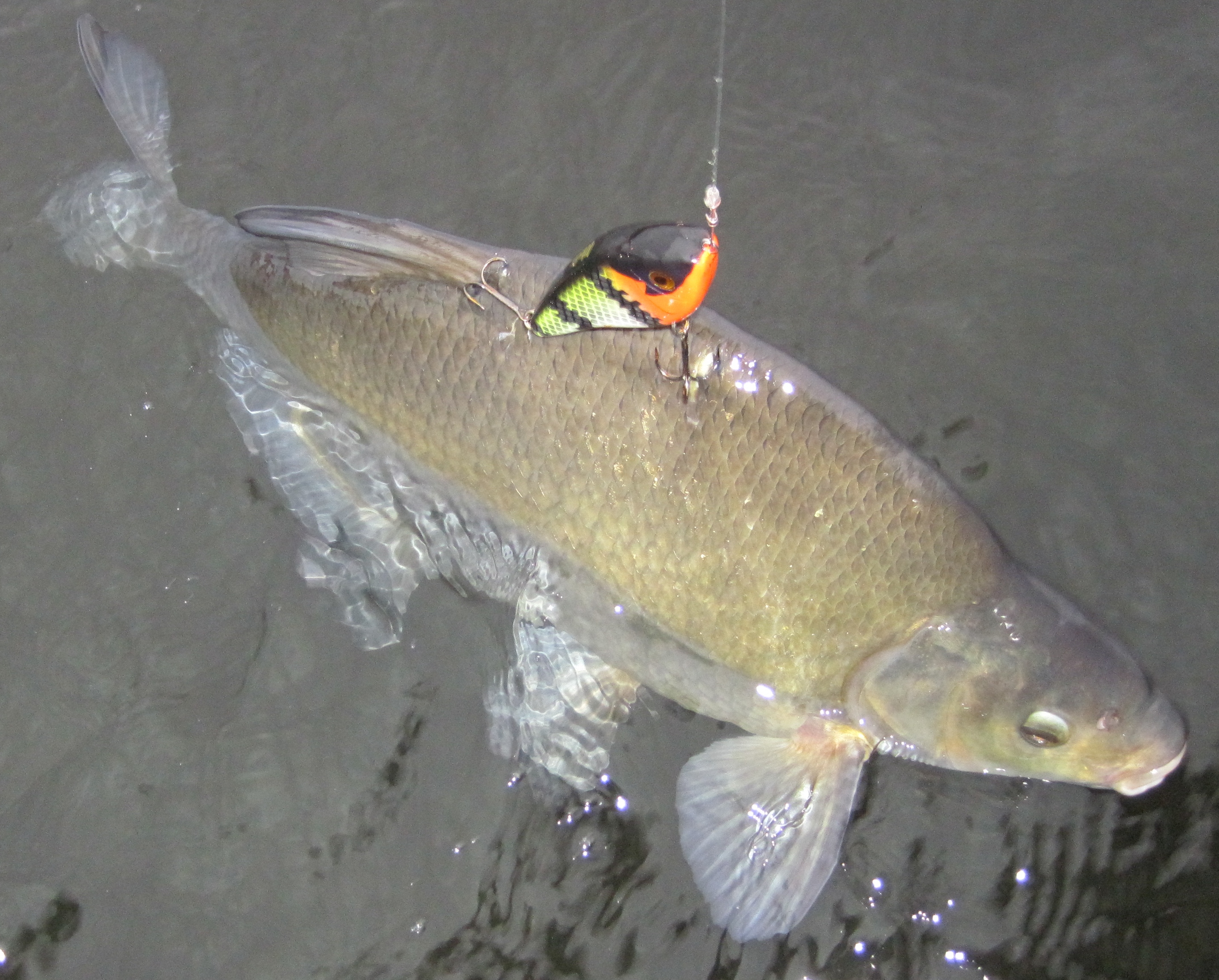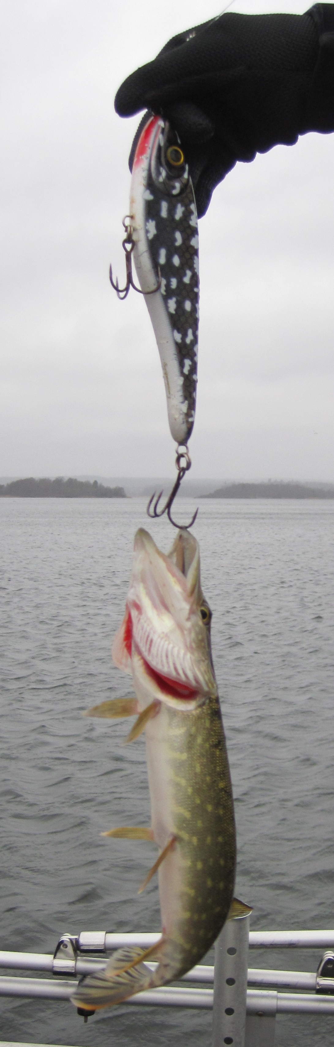 Vi fortsätter att fiska och driva i viken. det är trögt men vi lurar upp några gäddor, alla är små förutom en följare som missar betet. Denna är nog runt 85 cm. Vi kör på med samma taktik förutom ett ständigt plock i beteslådan. Jag tycker att Westinjerken funkar bra och känner något konstigt som stöter till betet, pang ett kraftigt mothugg och fast fisk sitter på betet. Det känns konstigt och lite lojt men nu drar fisken lina och känns tung. Hmm vad är det som händer? är det en bättre gädda eller. När fisken kommer upp till ytan visar det sig att jag har krokat en stor brax i ryggen, inte konstigt att den kändes tung.