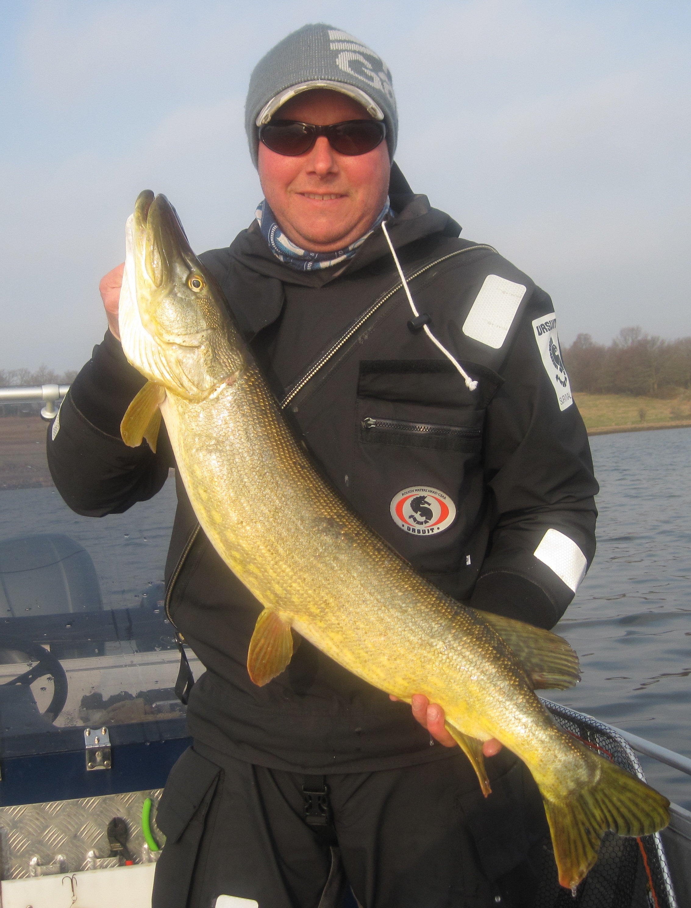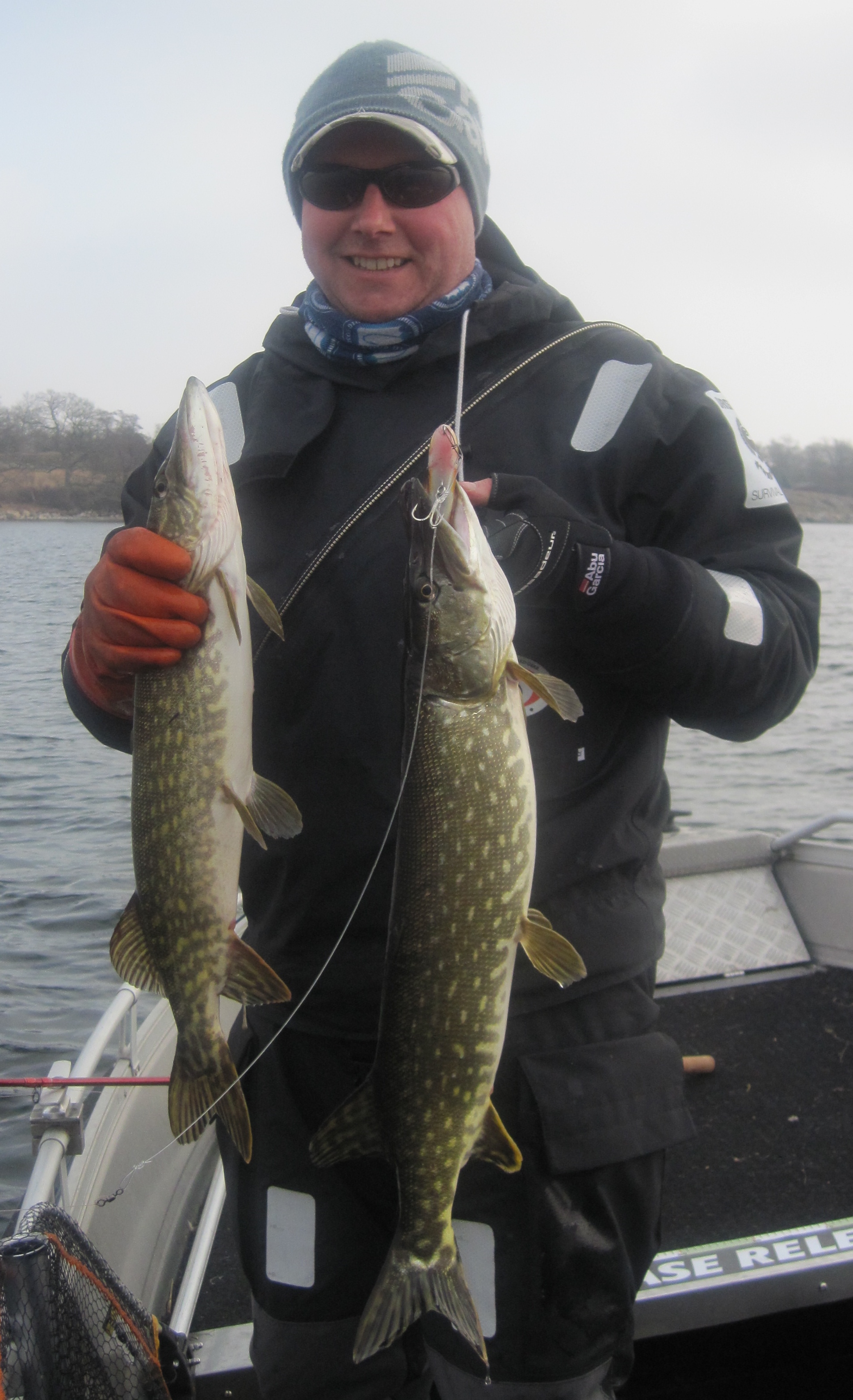 Det hade varit minusgrader under natten så båten var vit av frost och vid halv nio tiden lämnade vi åmynningen och körde mot det första stoppet. Vattnet krusade sig lite och vi drev sakta igenom viken. Willy hade några försiktiga kontaker med gäddor medans jag varken såg eller kände något. Vi närmar oss vasskanten och jag lägger ett kast precis intill och nu kommer ett tungt hugg. Odramatiskt följer hon snällt med och Willy håvar och lösgör betet som mer eller mindre ramlar ut ur munnen. Hon är tjock och fin och mäts till 92 cm, vågen visar 5,4 kilo. Jag känner mig nöjd och glad över fångsten och förhoppningarna på ännu större gäddor stiger.