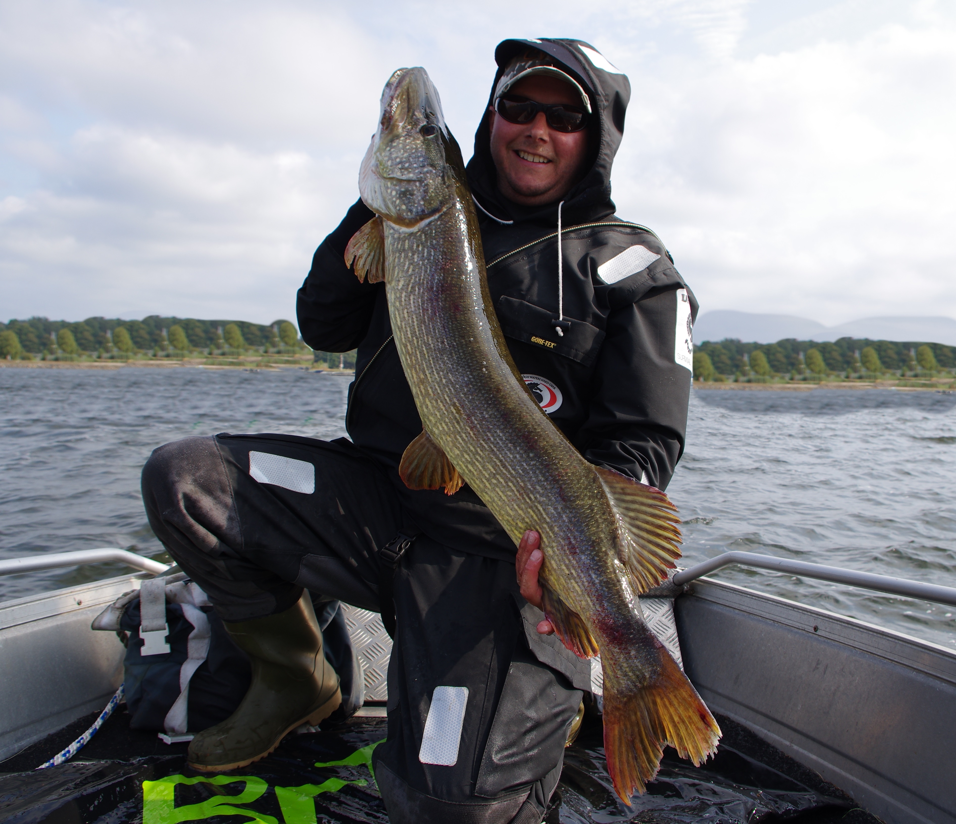 Vi provar oss runt och landar en del gäddor runt 85 cm innan Håkan ännu en gång får ett bättre hugg. Gäddan är tokig och väljer att hoppa vid båtkanten och draget lossnar, men lite tur ska man ha och en av krokarna fastnar i sidan på gäddan och jag kan strax efter håva in ännu en väldigt fin gädda. Håkan är jätte nöjd och förbereder kameran medans jag krokar av den i håven.