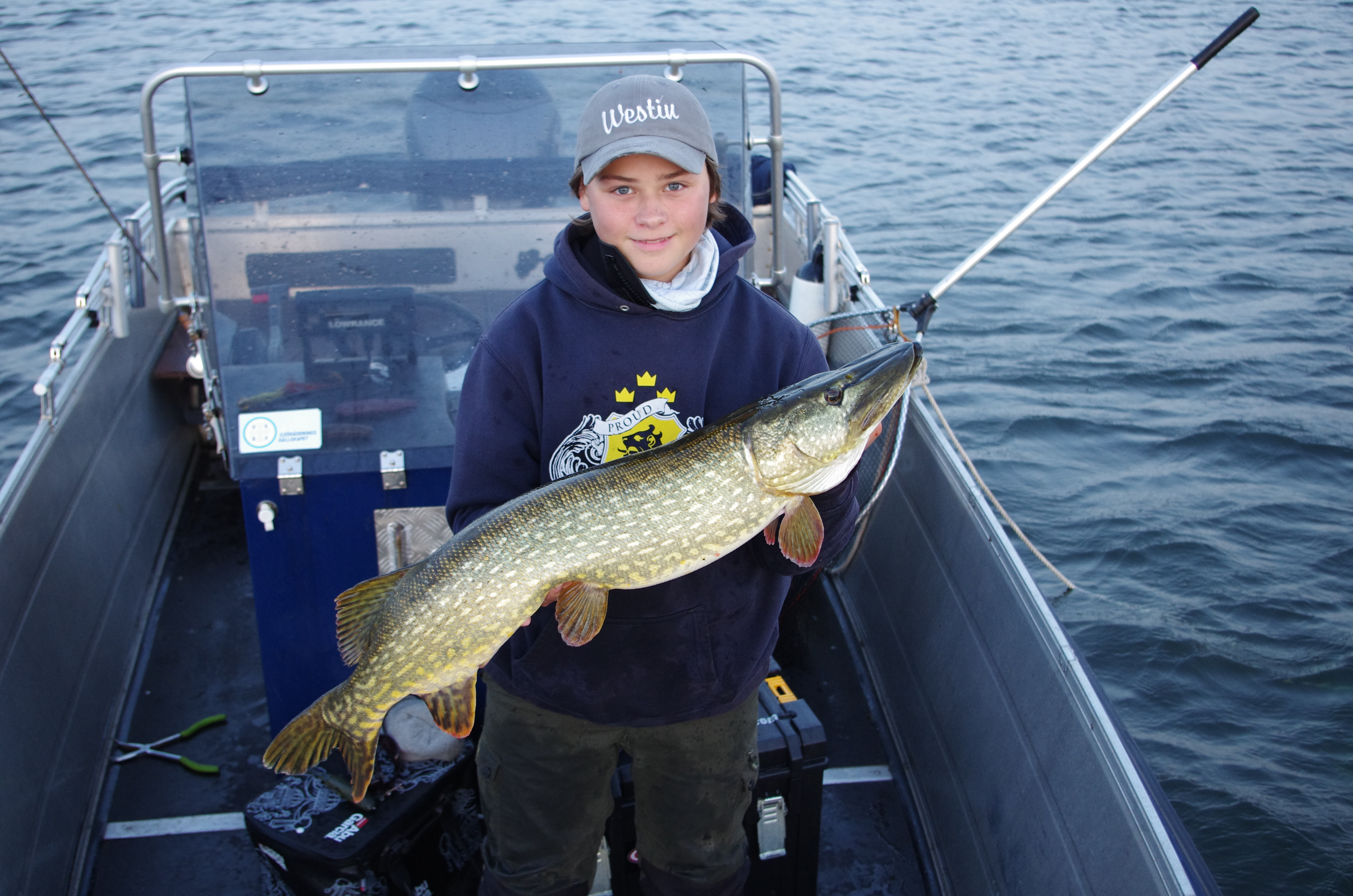 Efter lunchen och att gäddorna har tröttnat på oss gör vi ännu en omgruppering och vid 16 tiden hamnar vi precis på rätt ställe. Nu har vi kontakt med finare fiskar och det riktigt känns i hela kroppen som om 10+an kommer att hugga. Willy fångar dagens största gädda. En riktigt välmatad 93:a på 6,5 kilo, tyvärr missar vi de riktigt bamsiga gäddorna .