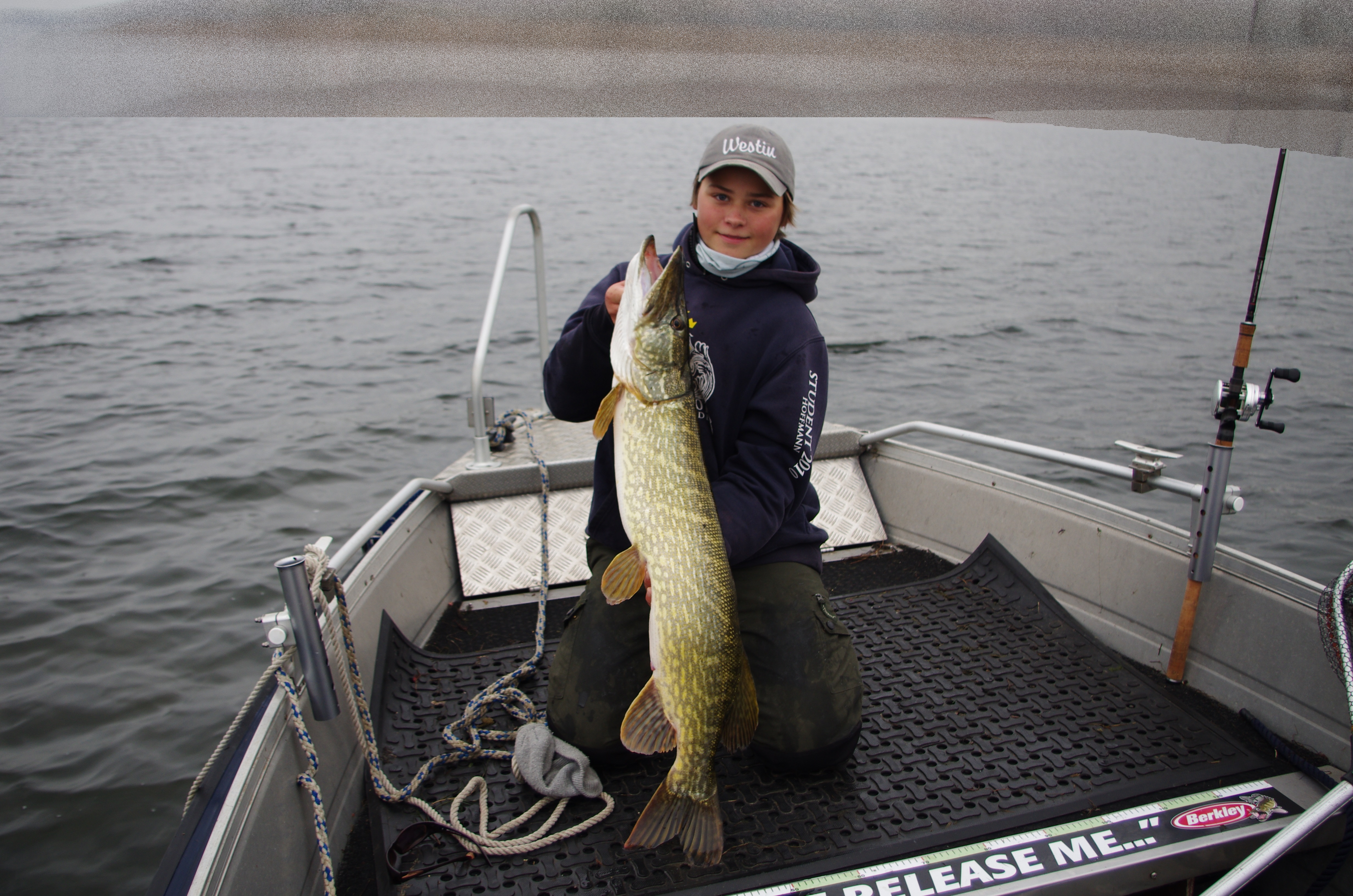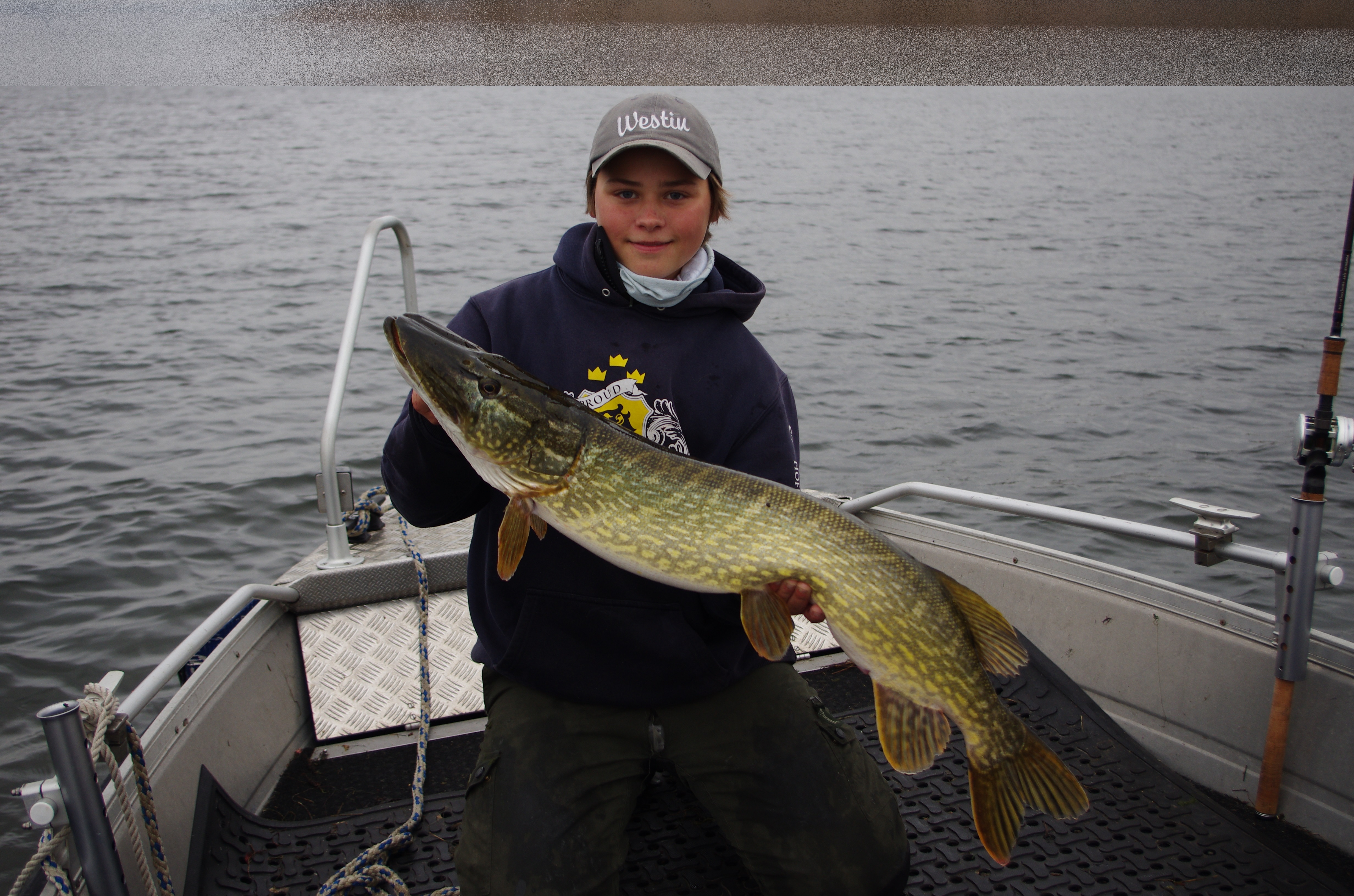 Tydligen så är även gäddorna hungriga på eftermiddagen och rätt som det är kommer det ett tyngre hugg på Willys spö. Gäddan kämpar dåligt och vi landar den utan komplikationer. Smal o lite klen är den men längden är fina 100 cm. Vikten är endast 6 kilo.