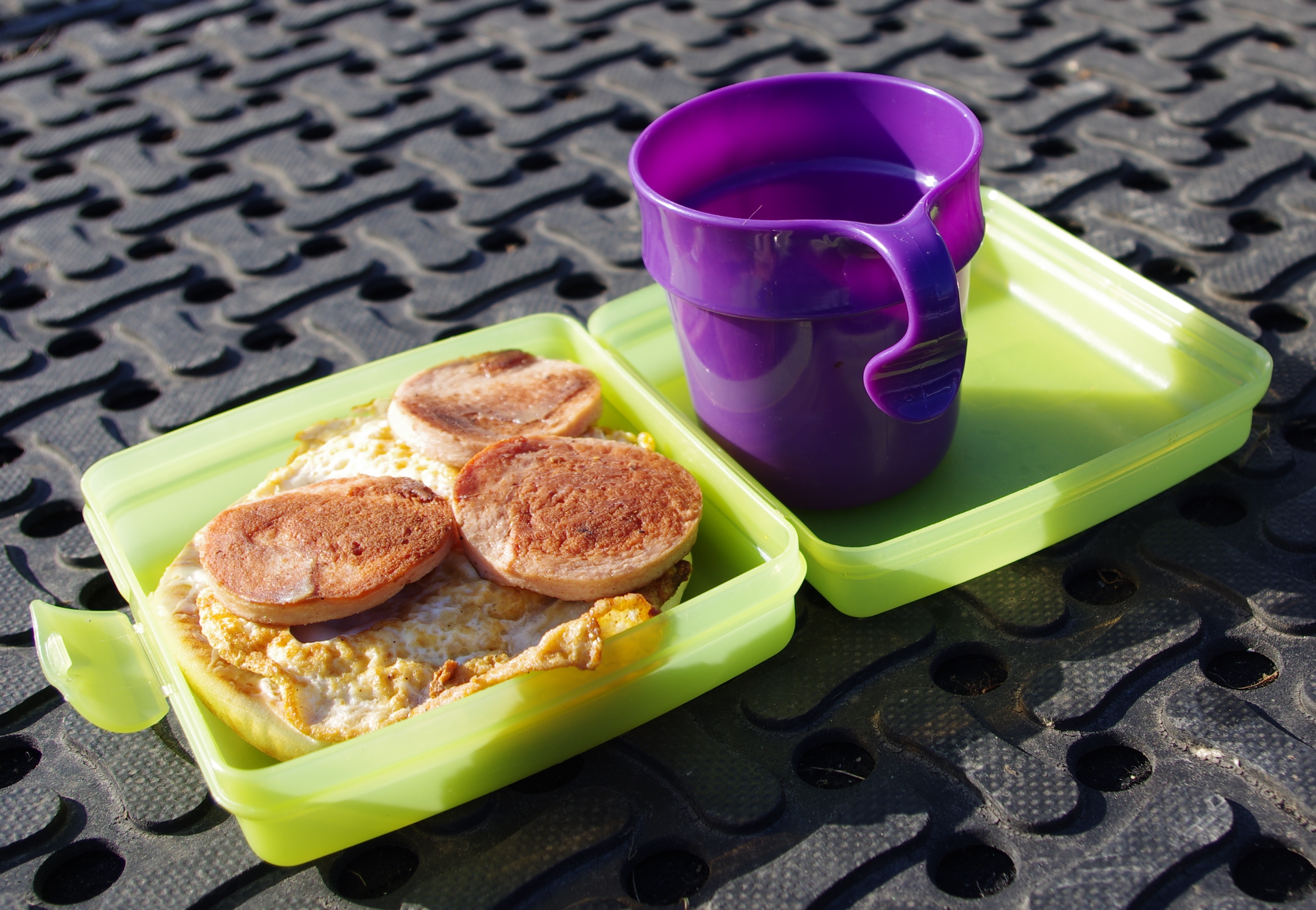 Vi lyckades inte utan plockade fram superfikan och njöt av vårsolen när den smaskades upp. Jag hade en klassisk långtadarchaffismacka. (Stekt ägg och falukorv)