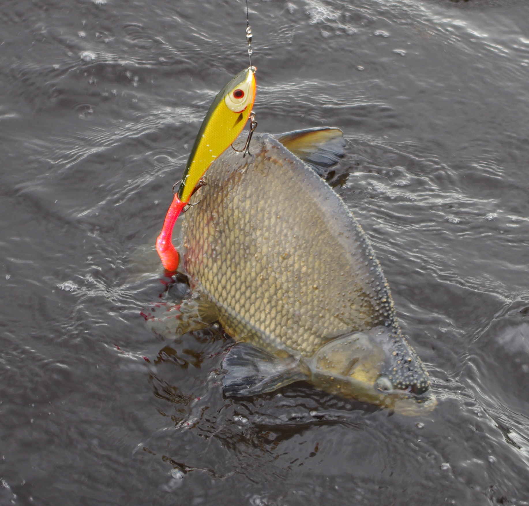 Efter ca 10 minuters fiskande så landar jag dagens första, inget direkt hårt hugg och inte så stor heller men ändå en bra start. Det kan bara bli bättre tänkte vi. Det går trögt för oss och endast kontakter med snipor gör att vi omgrupperar. Tyvärr så finner vi inte de stora madamerna under dagen. Dagens hårdaste kamp uppstår då jag krokar en bamsig Brax i ryggen. Ha ha !!!