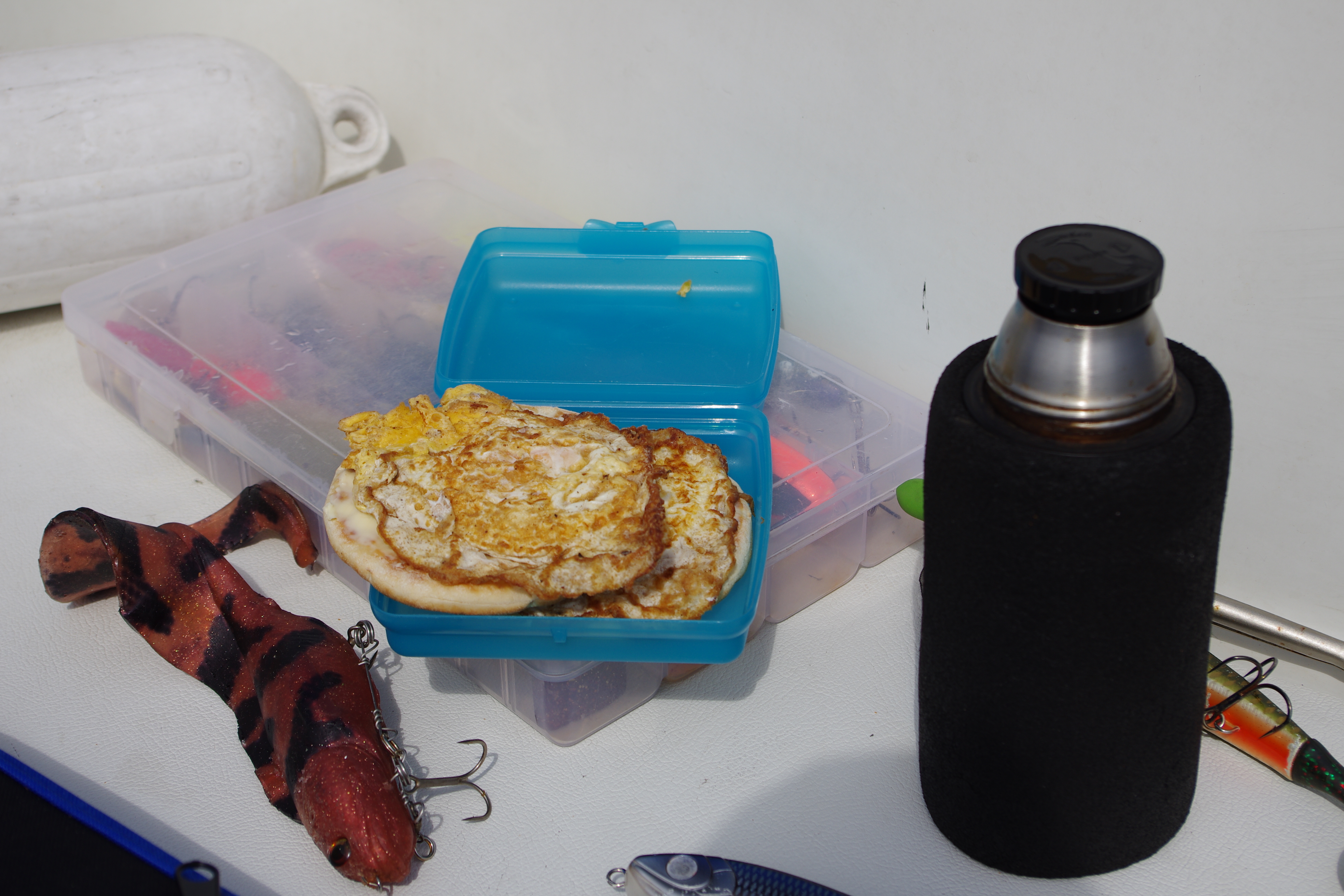 Efter en halv dags dåligt fiskande så åt vi några goda äggmackor och sedan SMS:ade vi till Jens för att höra hur det gick för dom.