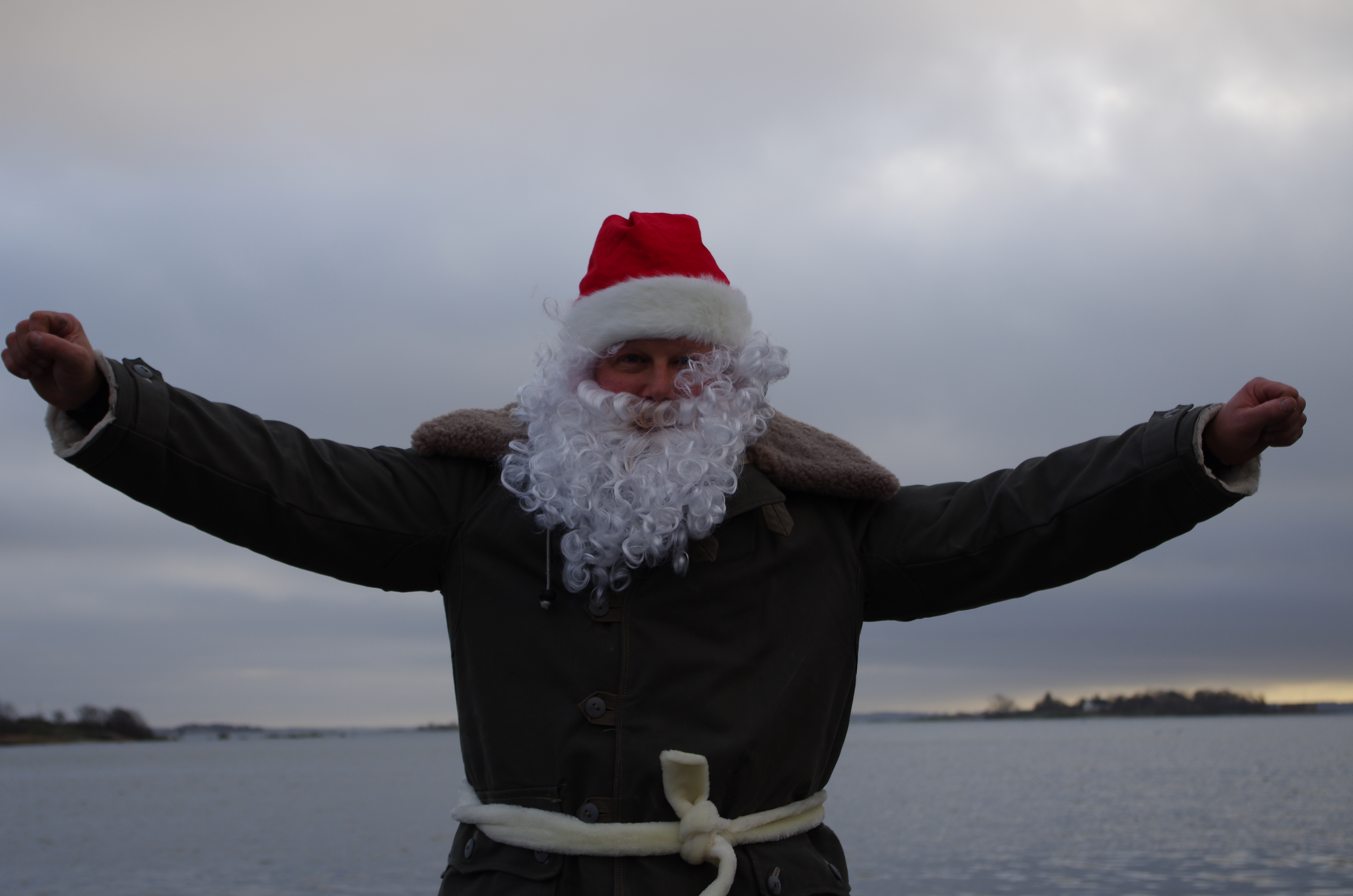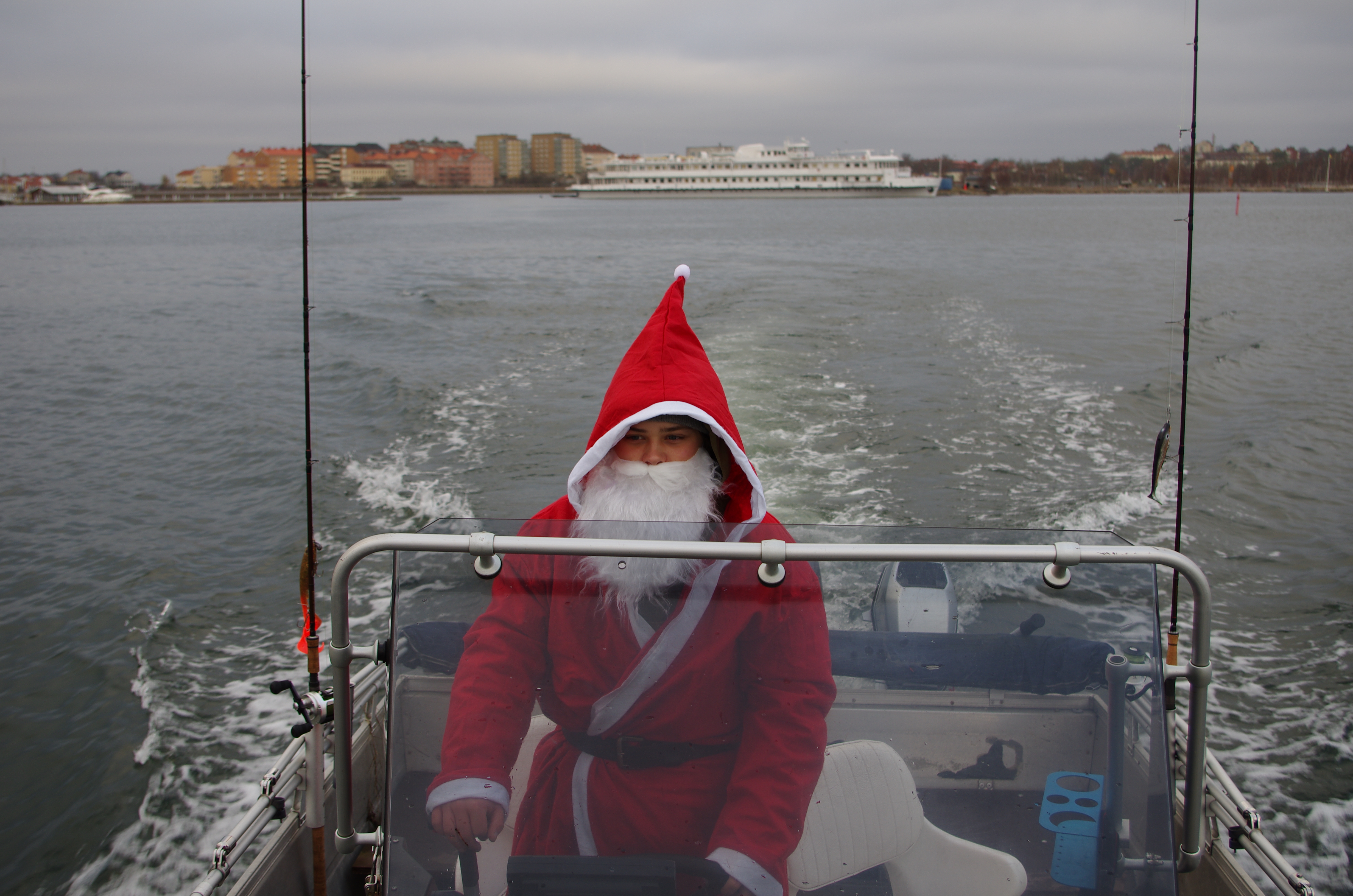Sagt och gjort. Vi driftade under en timme i hamnen för att försöka fånga julgäddan. Detta klarade vi inte av utan det räckte gott att höra alla tutande bilar och vinkande människor som gillade att tomtarna hade tagit en paus från julklappsutdelandet och fiskade i stället.