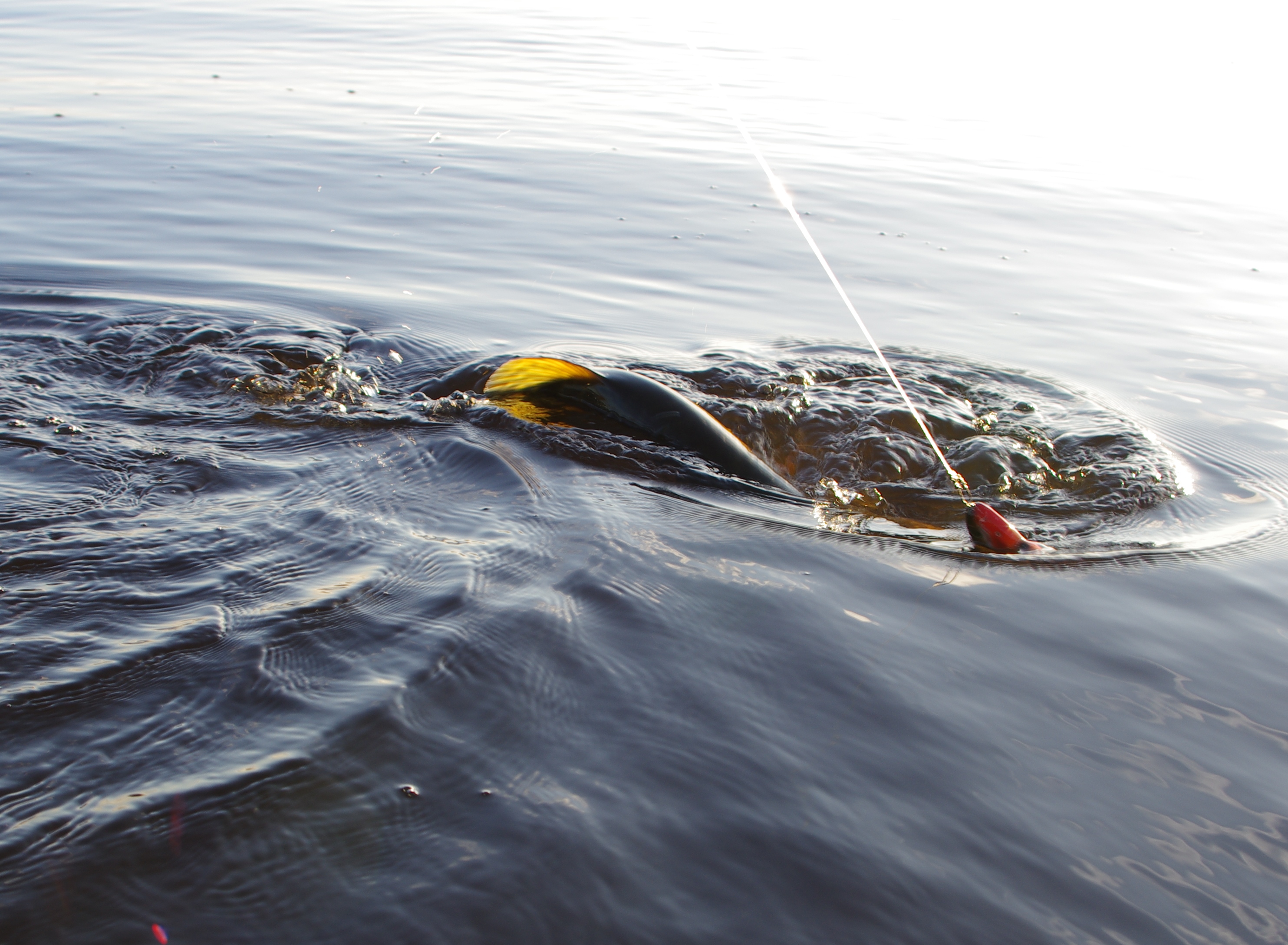 Efter några timmars fiskande på varierande ställen med endast lite pet i tailarna så är det äntligen fast fisk på Kråkans bete. En Buster Jerk har triggat huggreflexen.