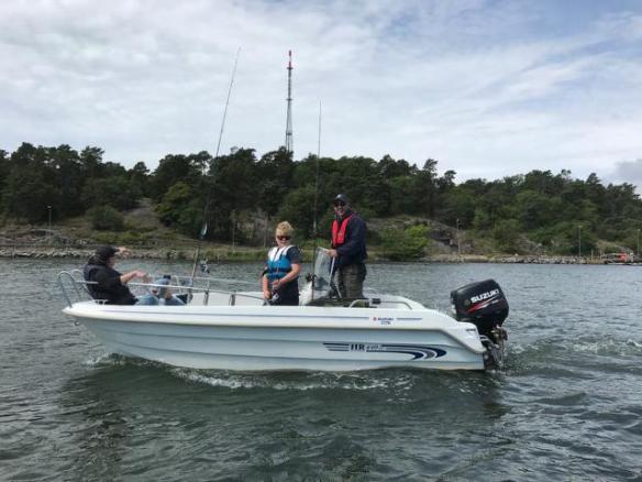 Vid niotiden var vi framme på campingen i Nyköping och kunde byta om till fiskekläder på parkeringen då stugan inte var klar att checka in i. Efter lite ompackning så åkte vi de 8 km till sjösättningsrampen och knuffade ned båten i havet.