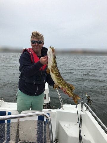 Tyvärr så landar vi inga gäddor och kan inte se några följare heller i det grumliga grönmjölkiga vattnet som vi fiskar över.