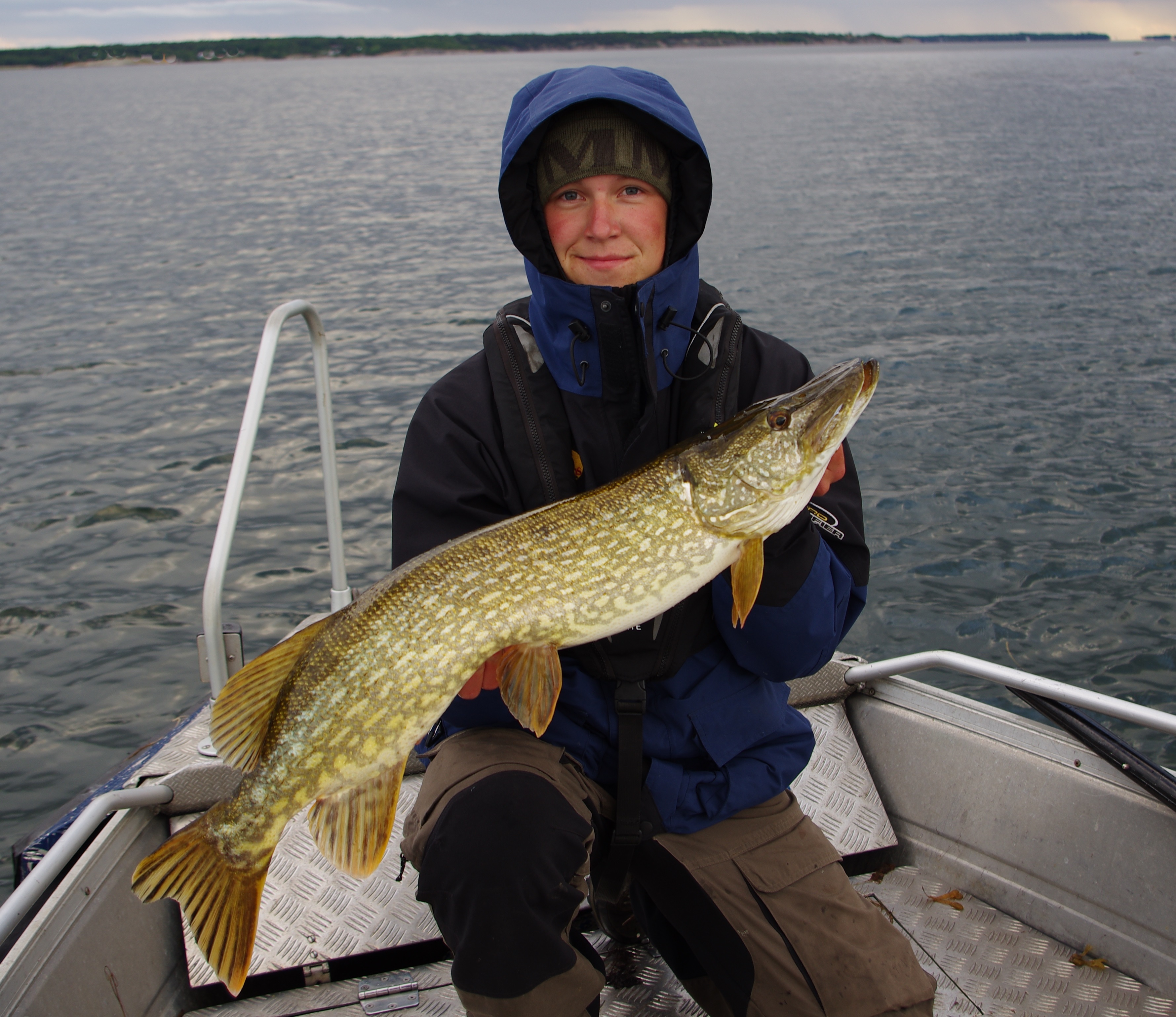 Ännu ett nytt punktställe. Vi ankrar upp och likt tre outröttliga robotar slungas våra beten iväg. Jajjemen ännu en gång väljer gäddan mitt bete. Gäddan är på hyggliga 82 cm. Efter en snabb fotosession så bålar jag iväg betet igen.