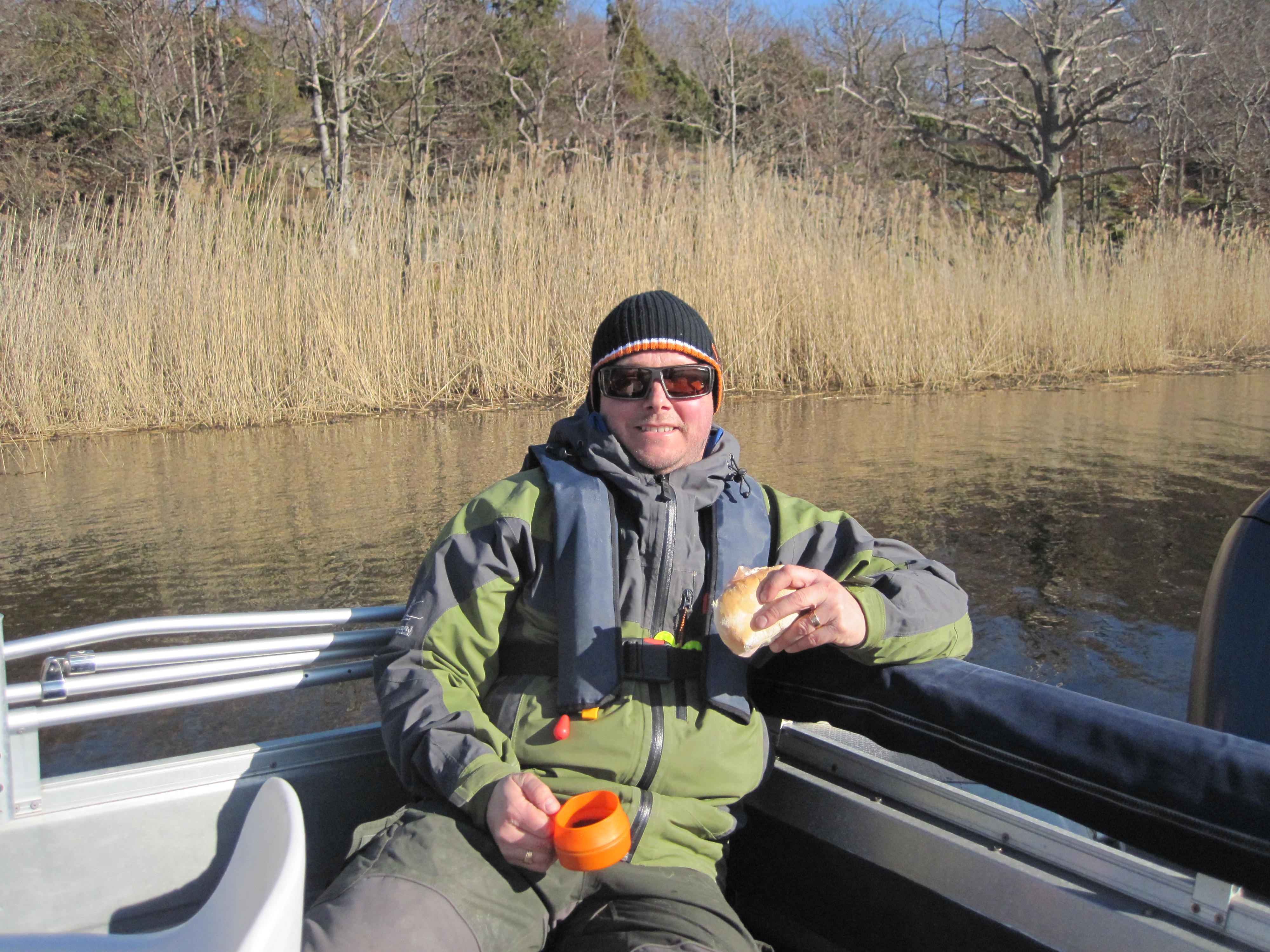 Vi åt frukost i båten för att samla lite kraft inför den planerade gångturen. Först planerade vi att gå till fyren för att sedan vända tillbaka en bit och ta en annan väg som leder till Getabro brygga. Därefter tog vi den rödmarkerade naturstigen tillbaka till bron mellan Utlängan och Stenshamn. För oss tog det ca två timmar att gå denna sträcka i det fina vädret.