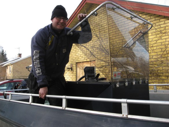 Strålande väder i Lyckeby denna lördag gjorde att man blev extra fiskesugen. Dock måste båten rustas och fixas lite inför säsongen. Fick hjälp av kollegan med att byta ut impellern på motorn. Detta gick mycket lätt. Ett av vinterns projekt har varit att fundera ut, samt att göra vindrutan fällbar, så att vi kan passera under Karlskronas broar. Detta för att slippa runda varvsområdet när vi skall fiska i Rosenholmsviken. Kommer att spara massvis med bensin med att gena mellan Lyckebyviken och Skönstavik. Gångjärnen till vindrutan är på plats, det skall monteras skenor som rutan vilar i på styrpulpetern. Det kommer att bli bra. Nästa projekt som håller på att ta form är en anpassad biminitopp över sittbrunnen.