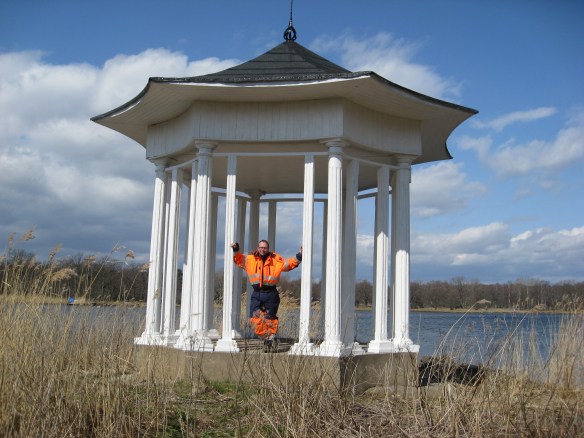 Vi var jätte sugna på att fiska efter att tittat på Kamms blog där man kunde se gäddor som Viktor och Johan hade fångat. Vi kom iväg vid halv tio och styrde båten mot sjuhallaviken för att fiska. Både Willy och jag tyckte att det blåste för mycket så vi beslöt oss för att fika på Ringholmen där vi hade sett en märklig paviljong i höstas. Vi förtöjde båten i lä och gick sedan bort till paviljongen där vi fikade. Det var det bästa denna dagen för vi fick inte det minsta hugg eller känning efter gädda. Antagligen var vi på helt fel ställen denna blåsiga dag.