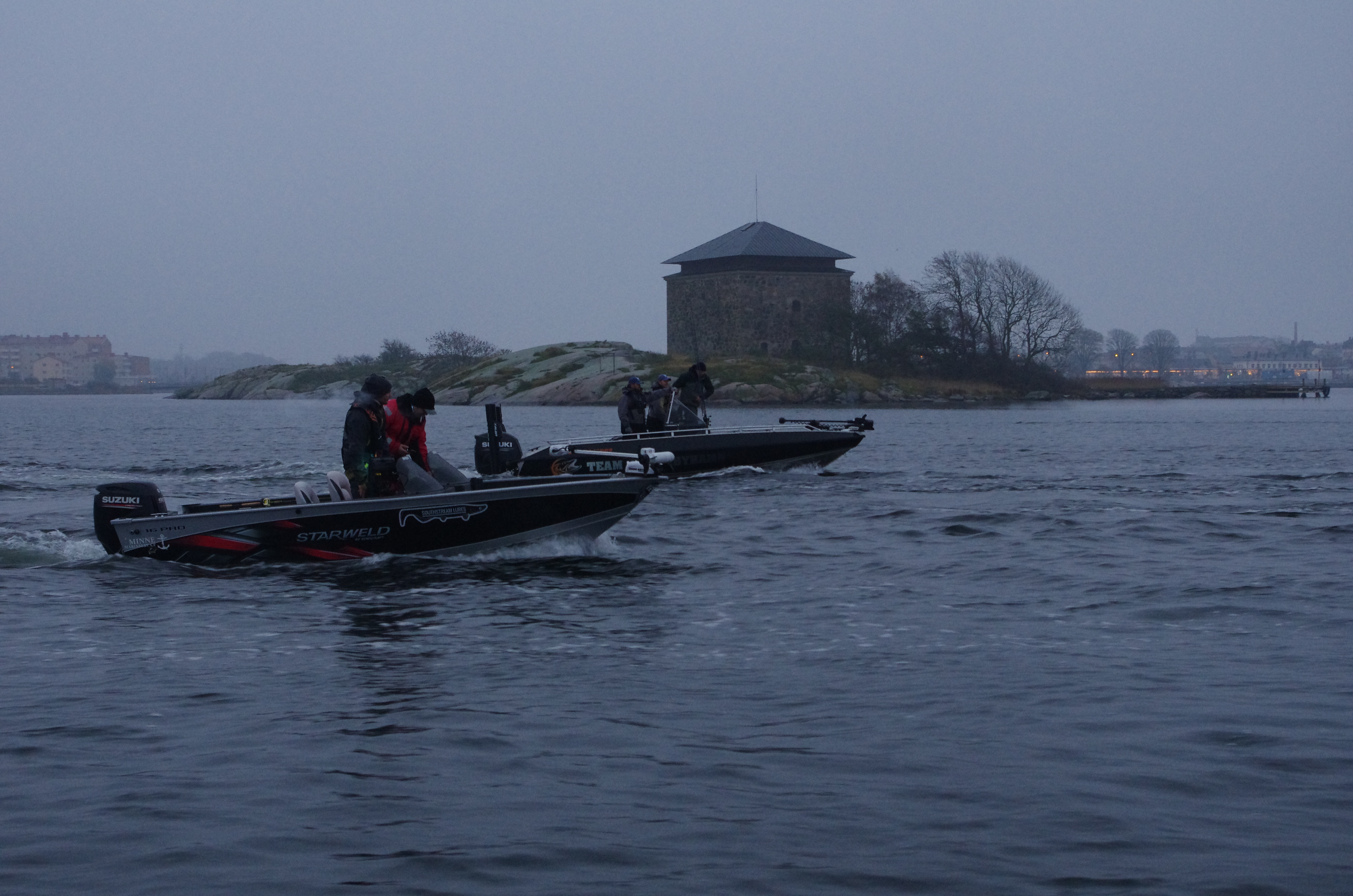 Vi gillar gemensam start från vatten så det var lite besvikelse när tävlingsledningen beslutade att det detta moment ersattes av att hämta mätbrädor vid Dragsö campings brygga för att sedan ta sig mot det planerade fiskestället. Klockan 08:00 börjar teamen fiska.