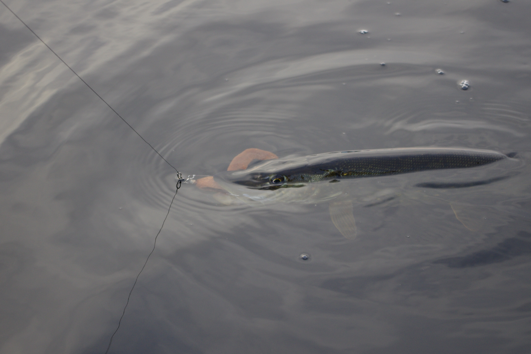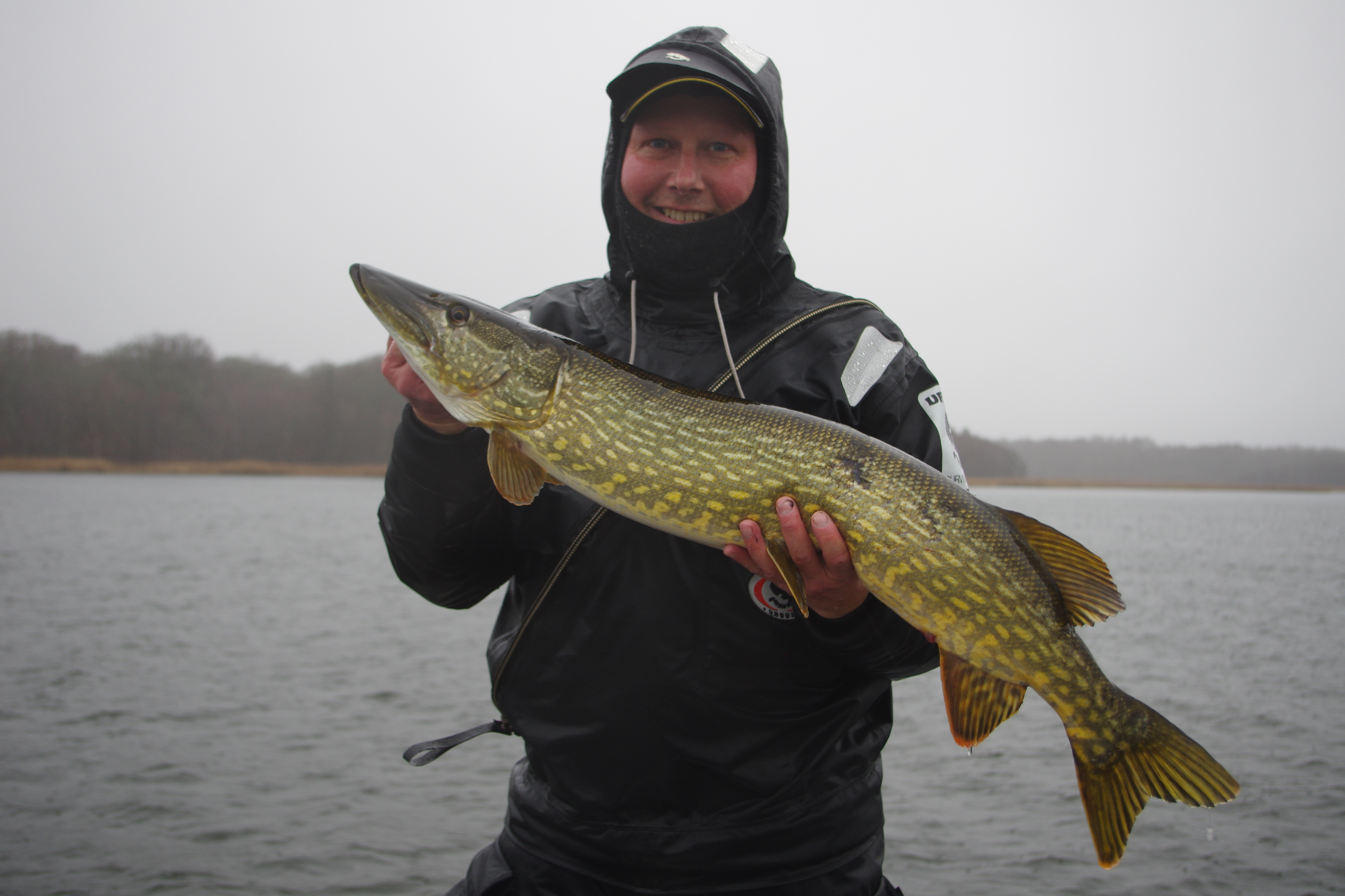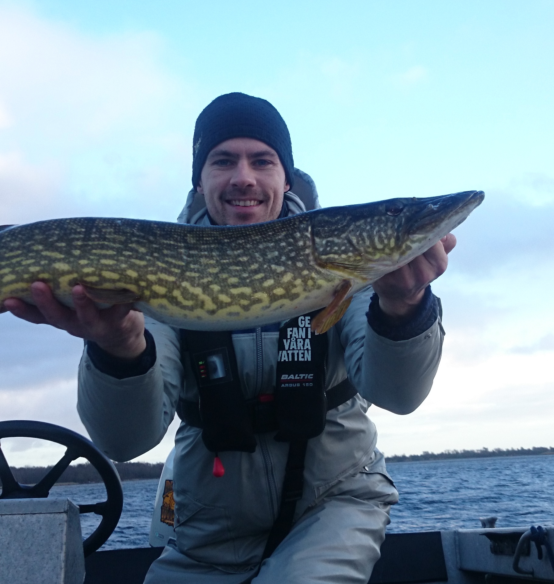 Vi pratar med varandra och analyserar viken och tror att gäddorna står och trycker längst vasskanterna på ca 50 cm djup. Efter 2,5 timmars nötande och frustration över det dåliga fisket landas den första gäddan av Jens.