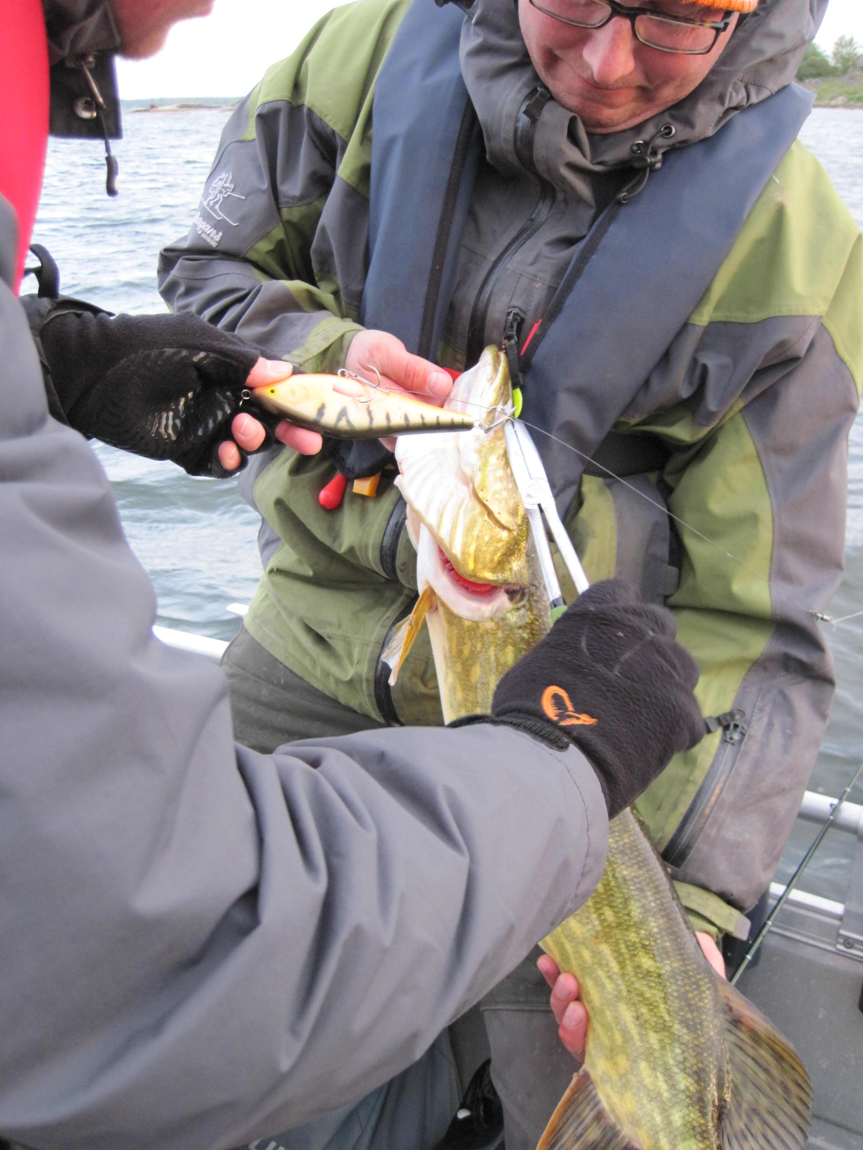 Vinden hade inte lagt sig och vi valde att fiska i vinden runt kobbar och skär. Kontakten med fisk var noll och ännu mera frustrerande var att få fiskerapporter från Team Jollyroger som fiskade på snarlika ställen. De hade följare som valar och även fina 4.5 kilos gäddor uppe i båten.