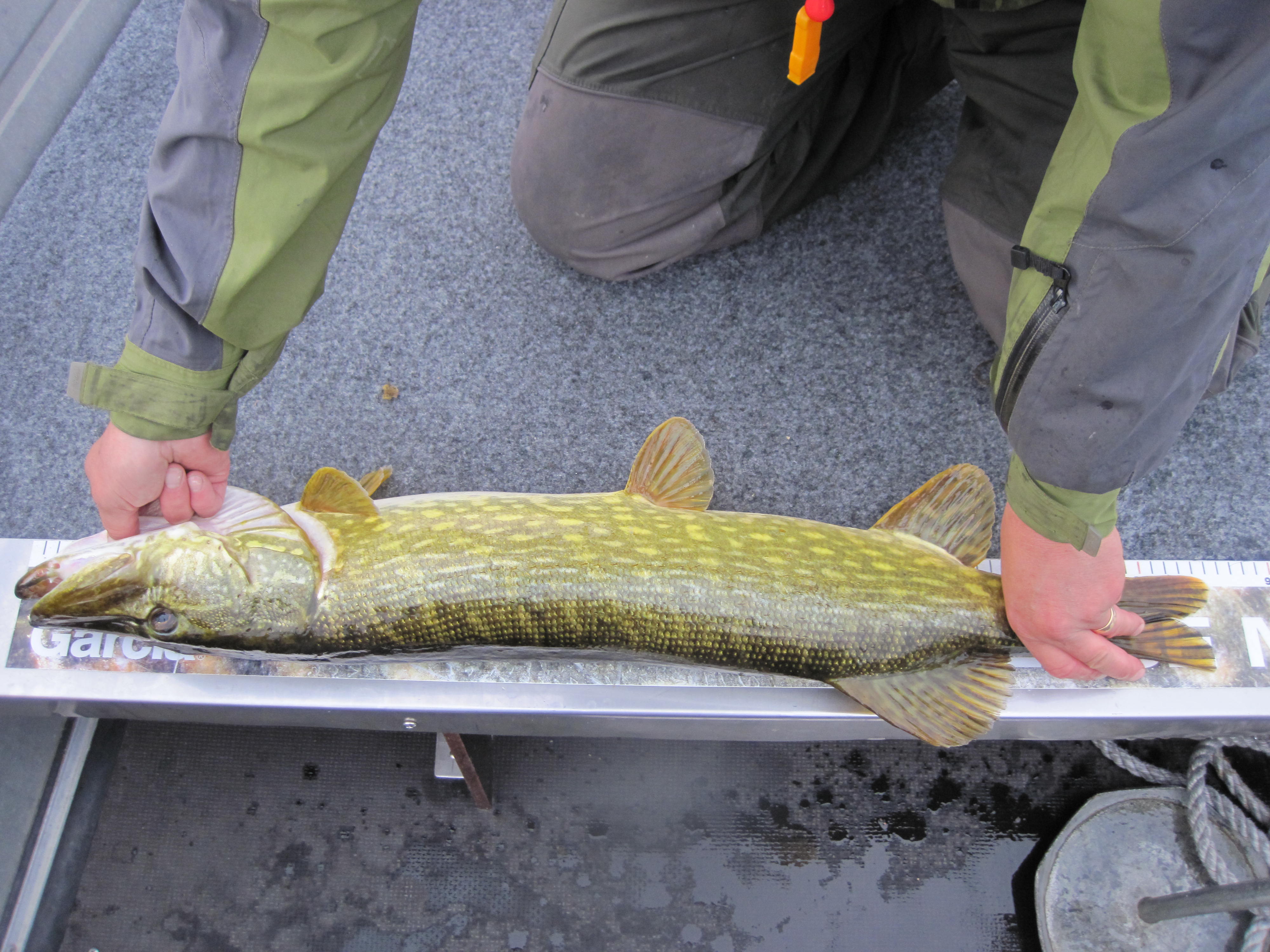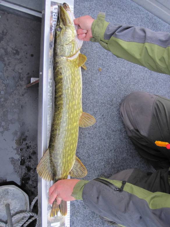Jag tyckte att vädret verkade ok för fiske när jag klev upp vid 06:30. Vädret var lite mulet och vinden obefintlig men från syd i alla fall. Vi åkte till ett grundparti utanför Tjurkö men det var inte våran cup of tea. Att fiska lite djupare med vobbler kändes långtråkigt så vi vände inåt för jerkbaitfiske i tången på ca två meters djup. Nu blev det kul igen och jag fick upp min första gädda på pigen-kanske har jag änligen fått in snitsen på intagningen av detta klassiska bete. Nåväl jag fiskade även med big bandit bruntorsk som även idag lurade upp två gäddor. Willy fiskade med haspel idag och agnade med 4play-detta fungerade också perfekt han fick upp tre gäddor. Totalt mellan klockan sju till tio landade vi 6 gäddor och samtliga var i trekilos klassen, vi hade kontakt med många flera gäddor under morgontimmarna så fisket var kul i dag.