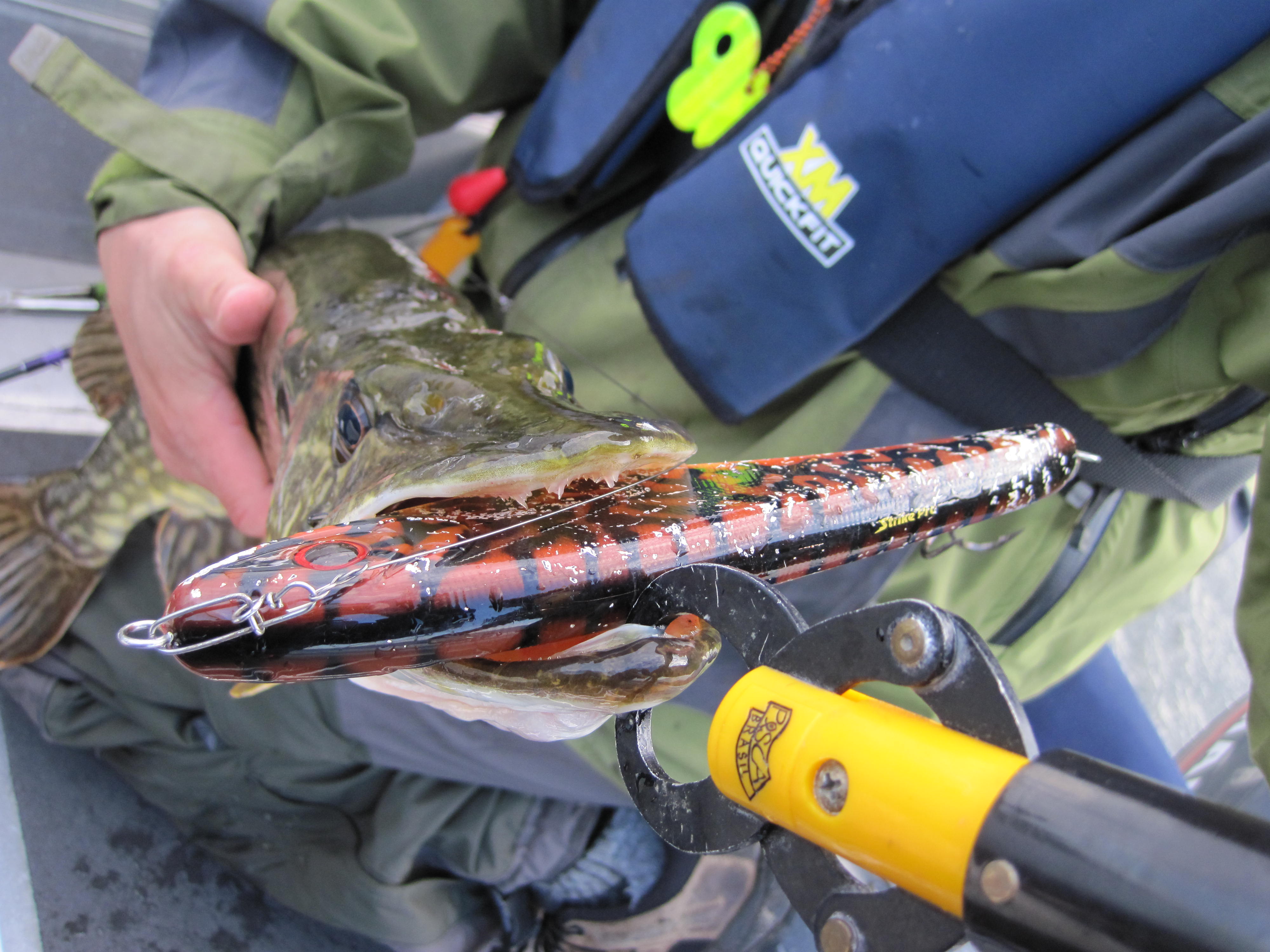 Gäddan har inte hunnit äta upp sig ännu. Med en längd av 97 cm tycker jag att matchvikten skulle vara mera än 5,5 kilo. Plast-tånglaken högg gäddan glupsk på.