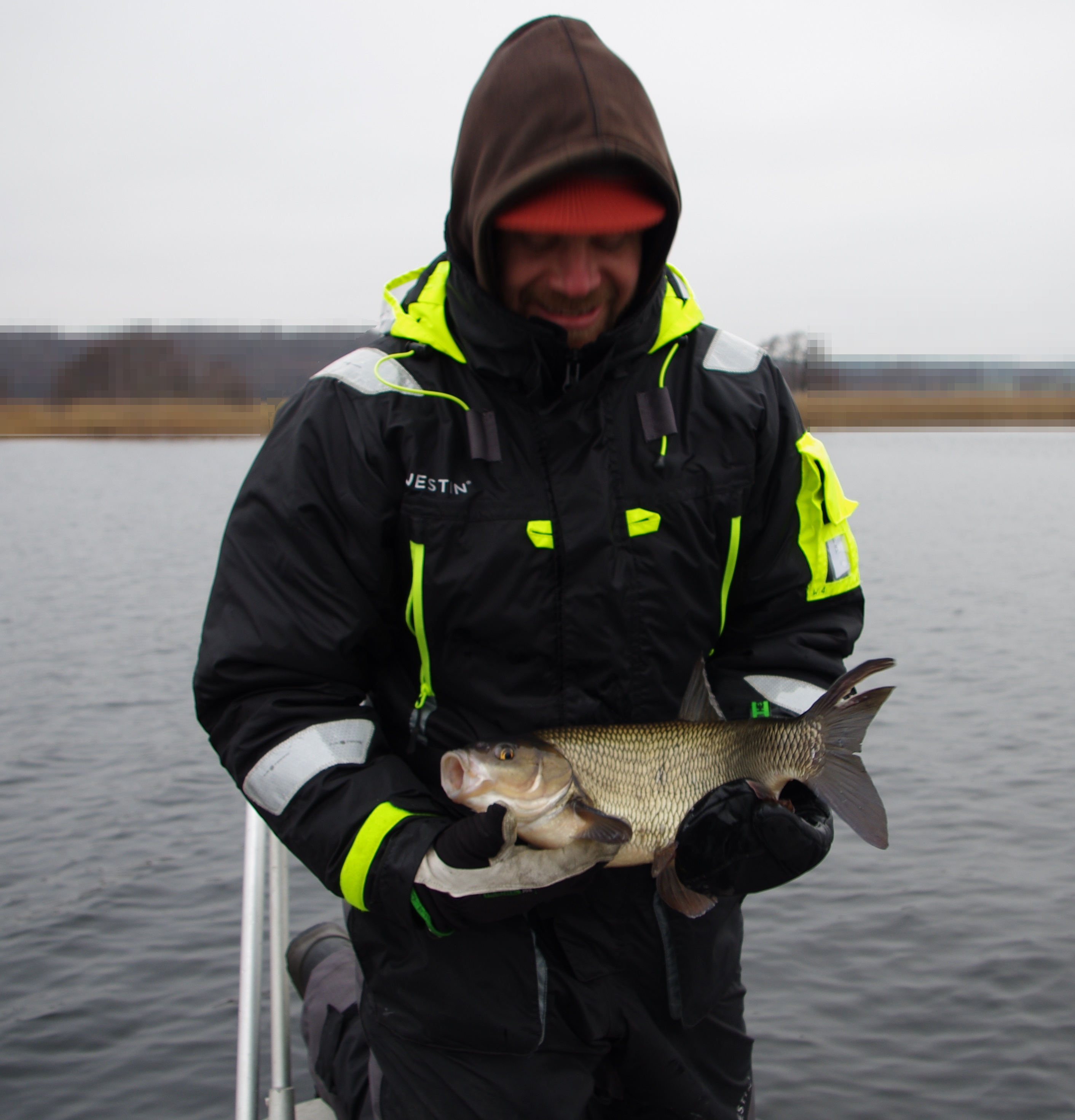 Vi ser att flera båtar har kommit inom området och det slutar regna. Willy tar av sig jackan och sätter på sig huvtröjan som brukar skänka honom tur. Betena slungas åter ut för att söka av vattnet och pang! Bättre fisk på Willys krok och vi håvar henne snabbt och skickar in bilderna till tävlingsledningen.