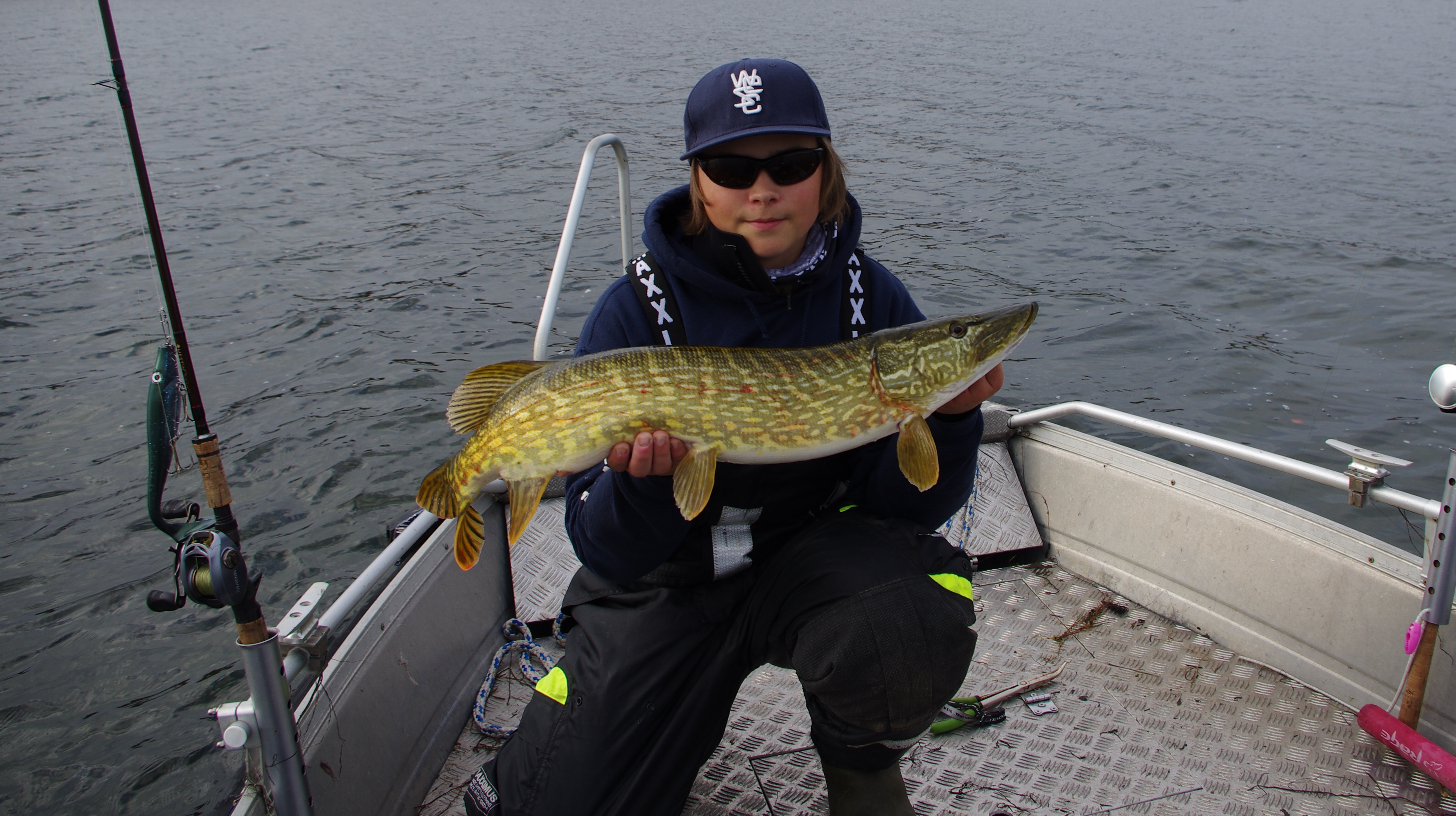 Det är jobbigt för oss. Vi forsätter i timmar utan några bättre kontakter men plötsligt ännu en fläck och jag har en bättre fisk på som garanterat hjälper oss in i ledningen. Halvvägs in till båten släpper hon och det känns som om vi nu missade chansen till pallplacering. Vi känner oss missmodiga men eftersom ankaret ligger i fortsätter vi att nöta och ca 5 minuter senare hojtar Viktor bättre fisk! Willy tar blixtsnabbt hem betet och fattar tag i håven och landar gäddan i nätet. Jag ser inte riktigt hur stor gäddan är men blir överlycklig då de rapporterar in en fin dam på 95 cm. Jippie! nu har vi faktisk en chans men osäkerheten är stor då vi inte kan veta hur de har gått för de andra gäddfiskarna.