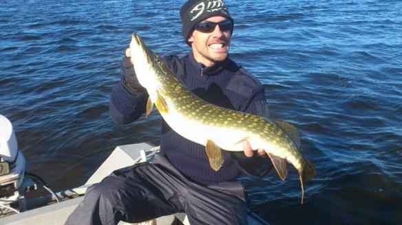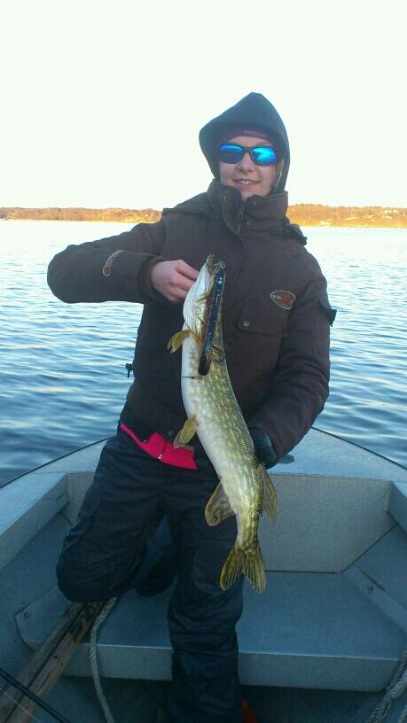 Idag var det bättre fart på gäddorna och vi hade ett kul fiske i det fina vädret och det smällde på bra men de riktiga grisarna uteblev. Jag fick upp en gädda som var lite tyngre än Angelica, min vägde 5,2 kg medans Angelicas vägde 4,6 kg.