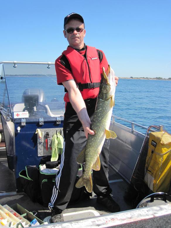 Vi åkte till kanten som willy och jag inte hade hunnit utforska ordentligt under förra fiskepasset. Peter har en följare på kast nr 2 och det verkar riktigt bra. Vi flyttar oss tjugo meter och då landar jag dagens första gädda en pigg gynnare på ca 60 cm. Gott vi är på gång!! efter en stunds nötande med endel påslag och följare förflyttar vi oss ännu längre ut i skärgården. Ute i havsbandet har vi ingen kontakt med fisk. Vi omgrupperar till en kant som brukar leverera gäddor. Jag fångar omgående en sjuttio cm gädda och vi har ganska många kontakter när vi driver längs kanten. Jag drar väg ett kast i motvind och det tar tvärstopp i rullen. Jag svär en salva och förbannade mig själv över hur klantigt detta super lintrassel var. Ingen exrarulle med i packningen så jag fick sitta och pilla med detta väldigt länge. Jag var tvungen att kapa bort en avsevärd längd av linan.