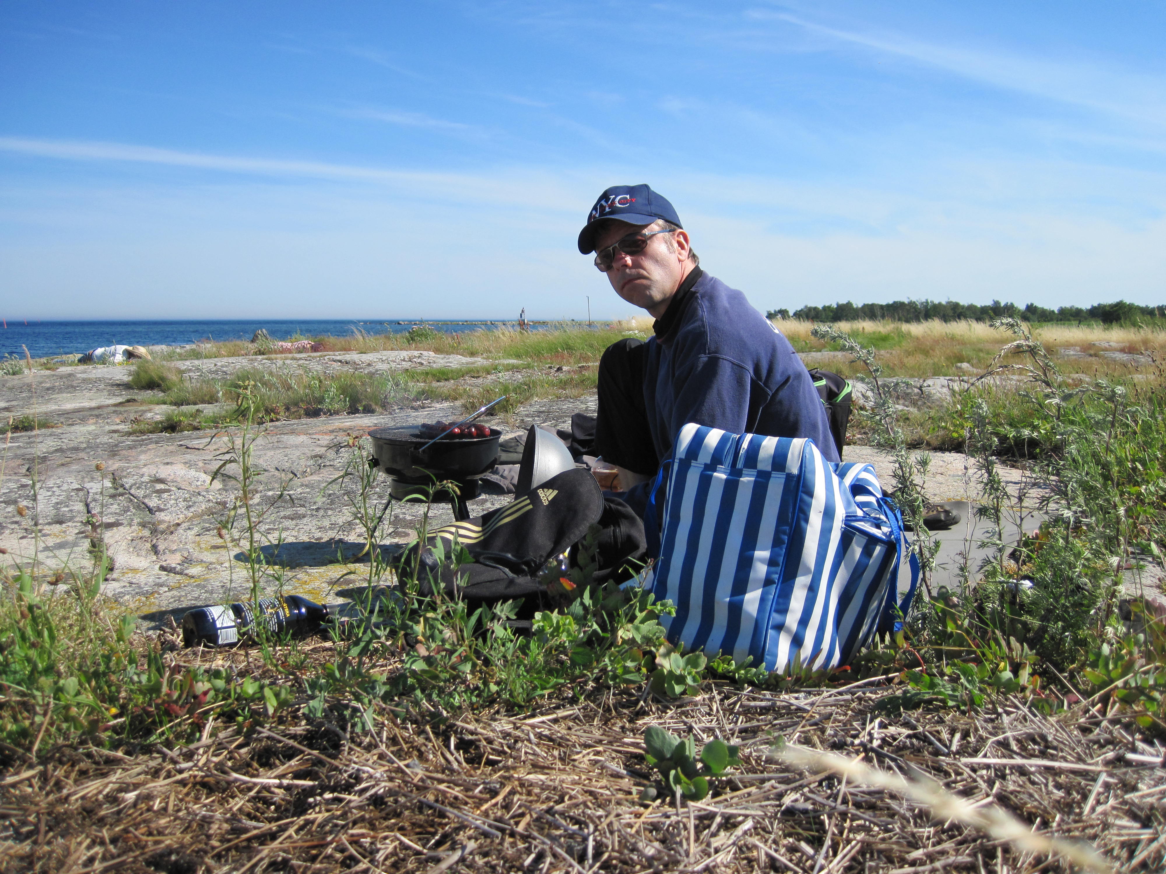 Vi känner oss ganska nöjda och kryssar lite mellan öarna innan vi stannar för kaffe och fralla. Jag har fortfarande inte lyckats trassla upp linan utan får sitta med detta en stund till. Puh äntligen är rullen klar för fiske igen och vi åker till nästa kant som borde vara bra. Här lyckas vi inte så bra endel påslag och följare men inget superfiske. Nu är det riktigt varmt och det bränner i nacken och ansiktet så vi åker en sightseeingtur i skärgården och beslutar oss för att grilla ute på Långören där Peter aldrig har varit.