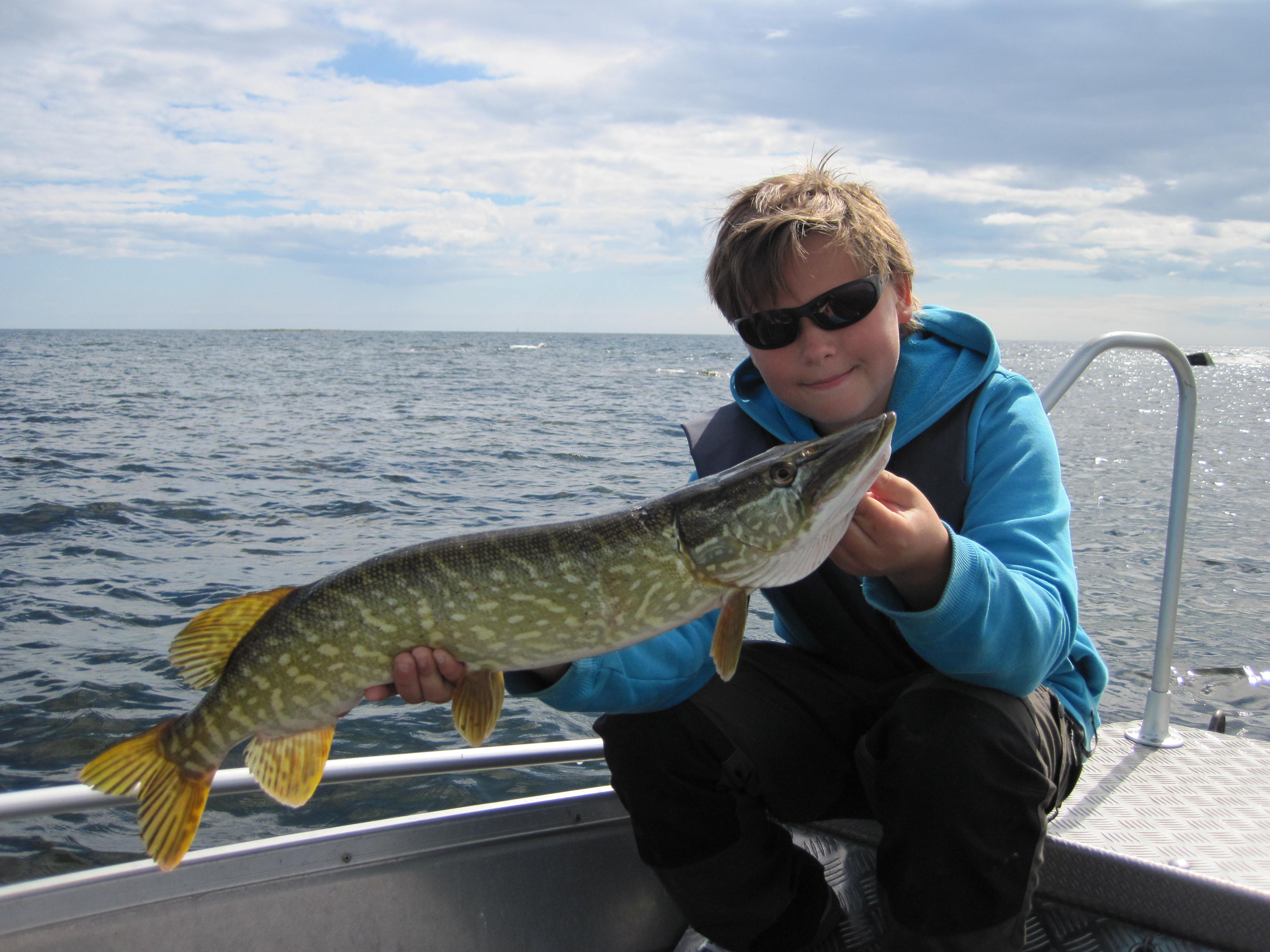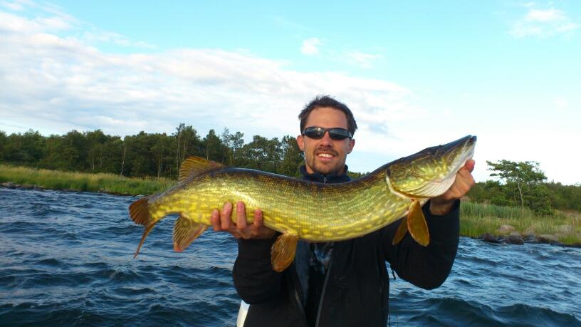 Vi åkte till kanten som willy och jag inte hade hunnit utforska ordentligt under förra fiskepasset. Peter har en följare på kast nr 2 och det verkar riktigt bra. Vi flyttar oss tjugo meter och då landar jag dagens första gädda en pigg gynnare på ca 60 cm. Gott vi är på gång!! efter en stunds nötande med endel påslag och följare förflyttar vi oss ännu längre ut i skärgården. Ute i havsbandet har vi ingen kontakt med fisk. Vi omgrupperar till en kant som brukar leverera gäddor. Jag fångar omgående en sjuttio cm gädda och vi har ganska många kontakter när vi driver längs kanten. Jag drar väg ett kast i motvind och det tar tvärstopp i rullen. Jag svär en salva och förbannade mig själv över hur klantigt detta super lintrassel var. Ingen exrarulle med i packningen så jag fick sitta och pilla med detta väldigt länge. Jag var tvungen att kapa bort en avsevärd längd av linan.